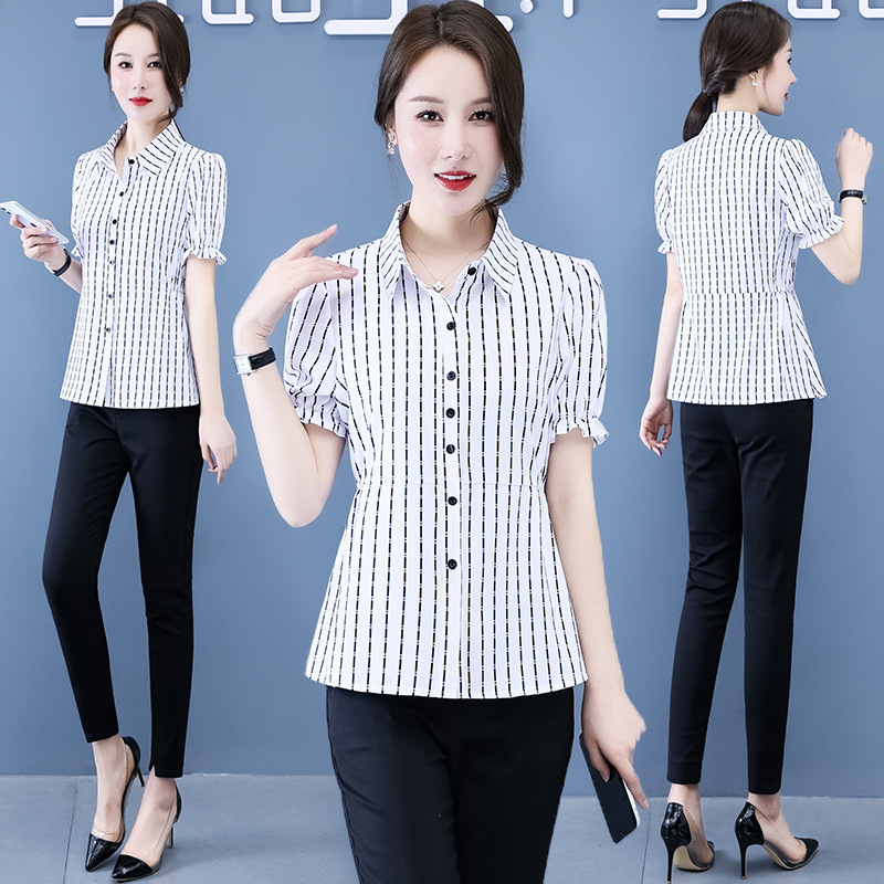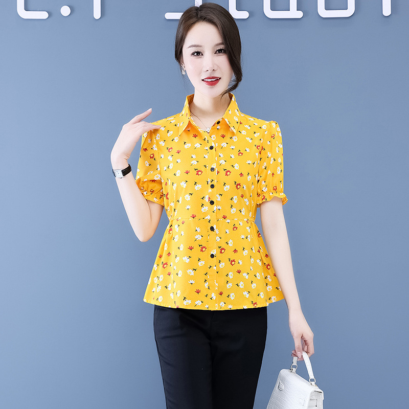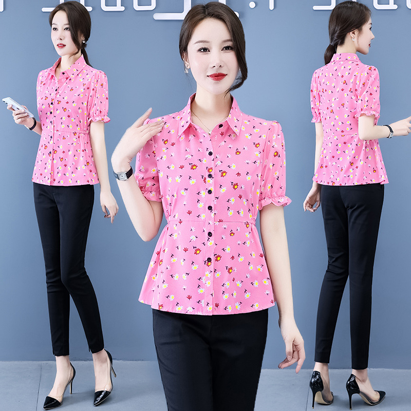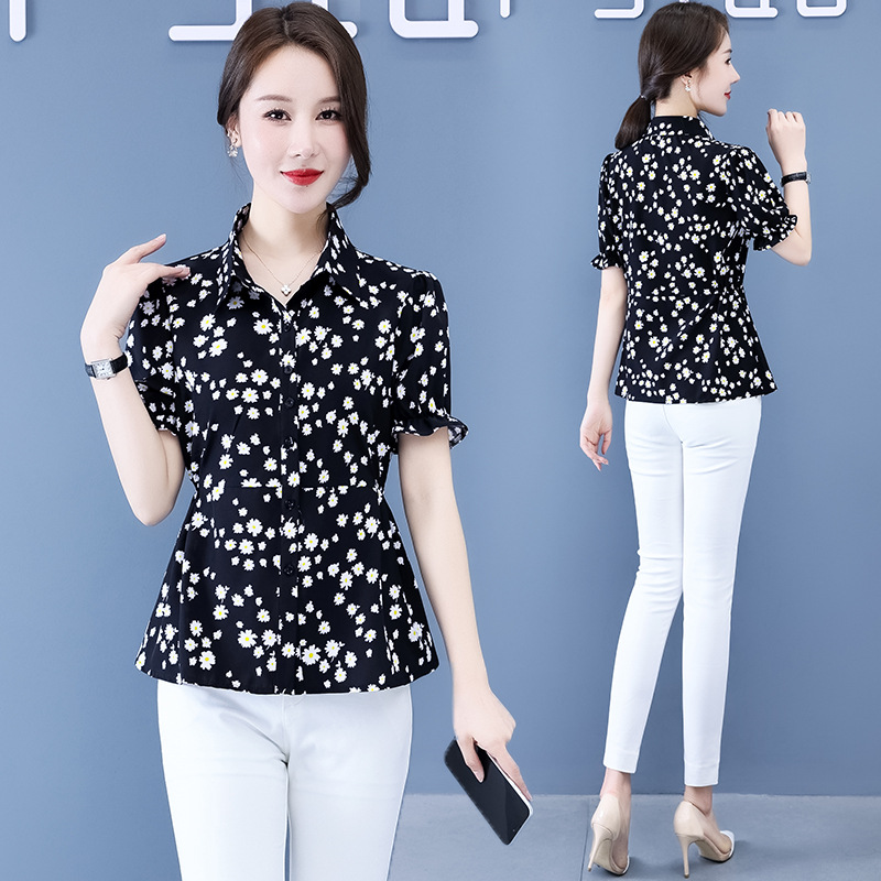 반팔 셔츠 여성용 여름 새로운 한국식 올매치 프린트 쉬폰 슬림핏 여성용 셔츠 플러스 사이즈 탑 웨이스트 플리츠