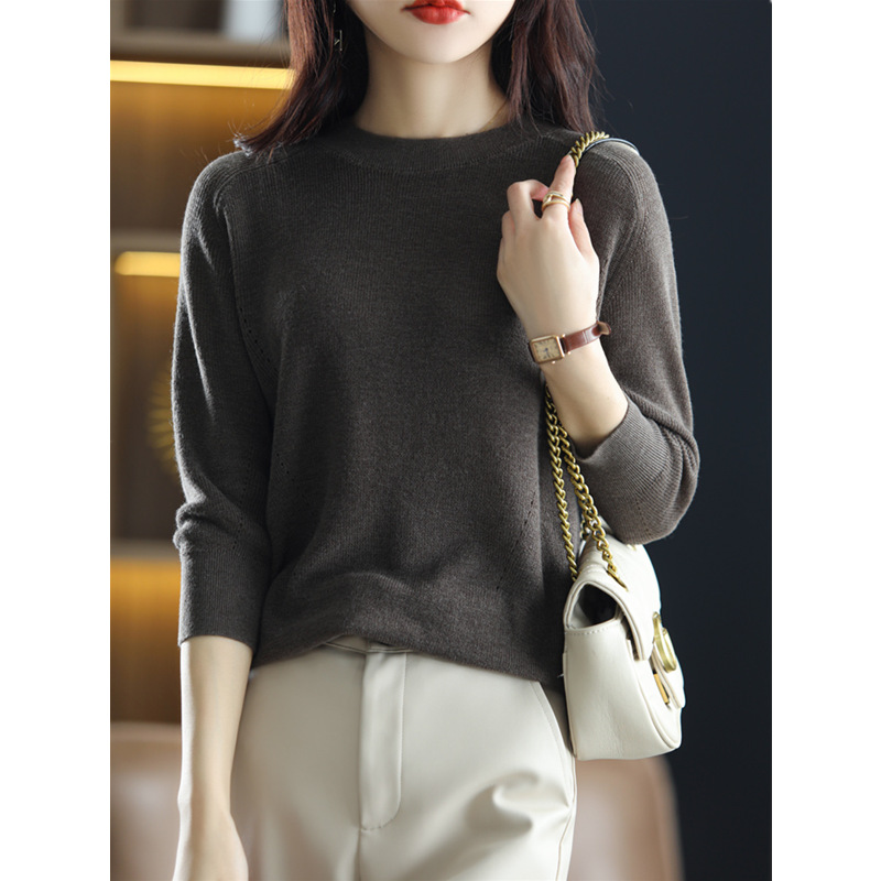 패션 우아한 박쥐 소매 얇은 7 점 슬리브 울트라 미세 울 니트 짧은 소매 여성용 라운드 넥 느슨한 반 소매 기본 셔츠스토어 가기