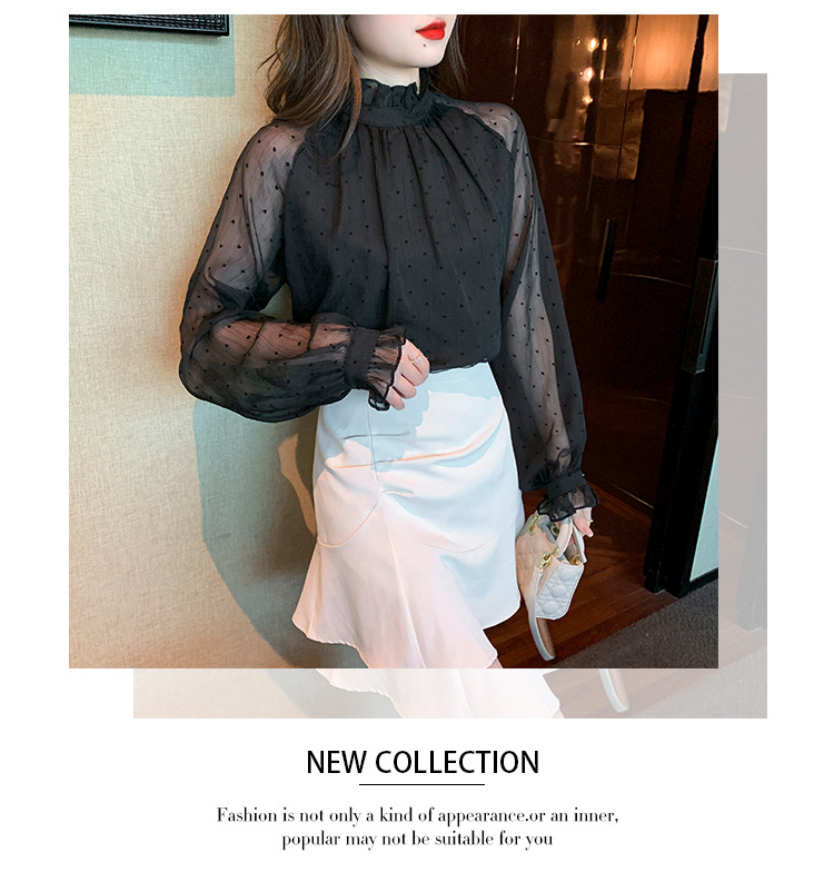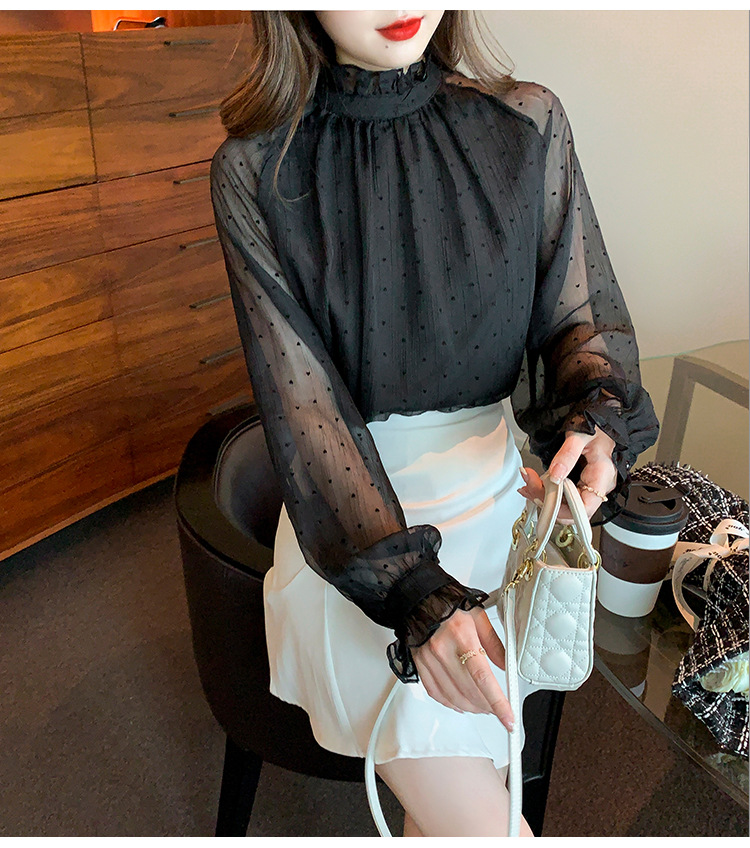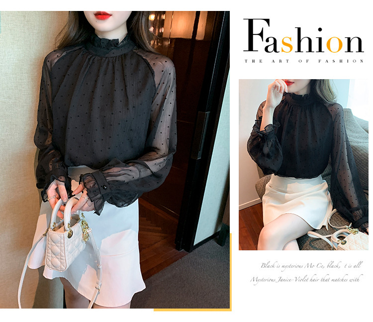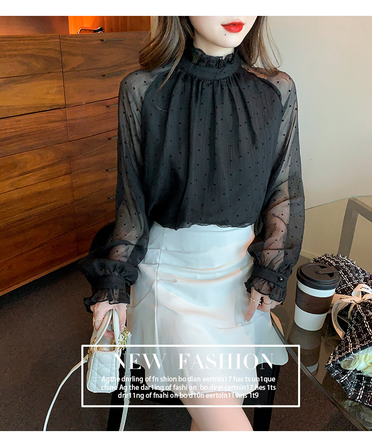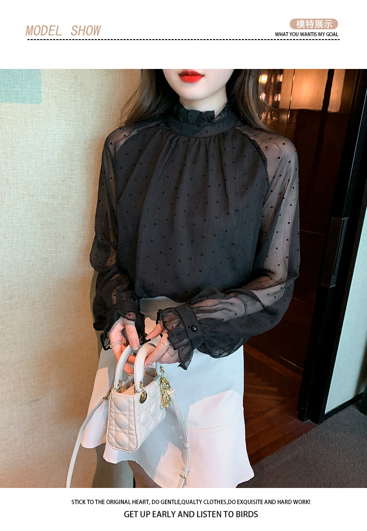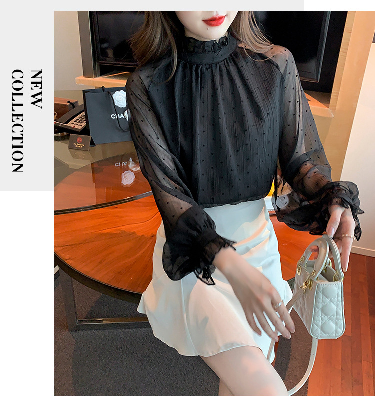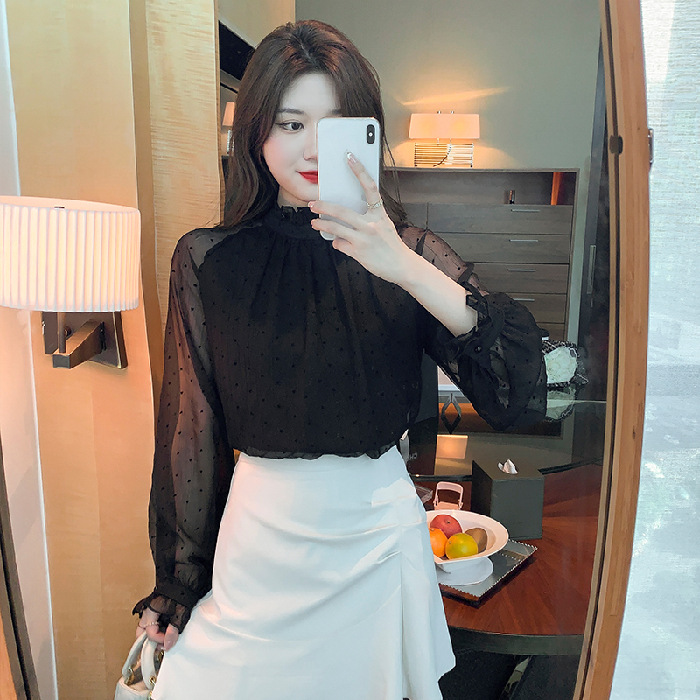 블랙 쉬폰 셔츠 여성용 디자인 감각적인 니치 스타일 스탠드 칼라 메쉬 셔츠 2026년 봄 레트로 홍콩 스타일 탑스토어 가기