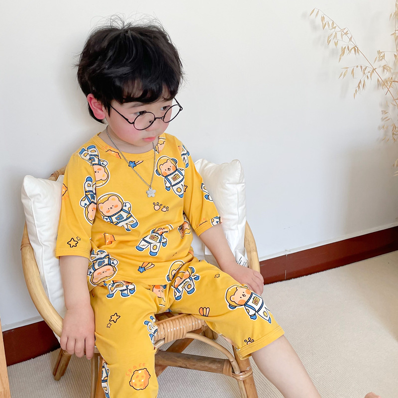 아기의 뼈없는 면 잠옷 봄과 여름 어린이 원활한 세트 남아 중간 소매 가정복 여아 에어컨 옷 얇은스토어 가기