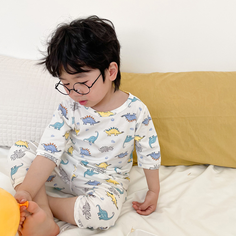 아기의 뼈없는 면 잠옷 봄과 여름 어린이 원활한 세트 남아 중간 소매 가정복 여아 에어컨 옷 얇은