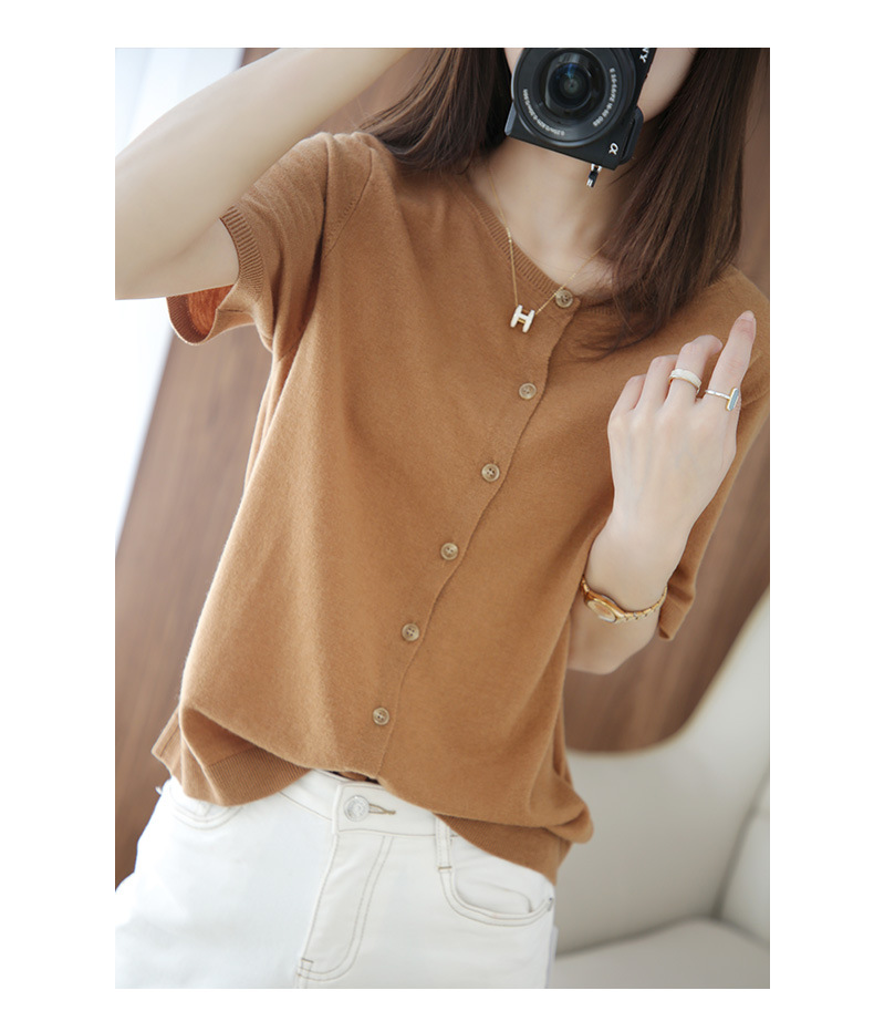 여름 새로운 얇은 얼음 실크 반팔 니트 카디건 여성용 양면 에어컨 셔츠 스커트 탑 짧은 느슨한 코트