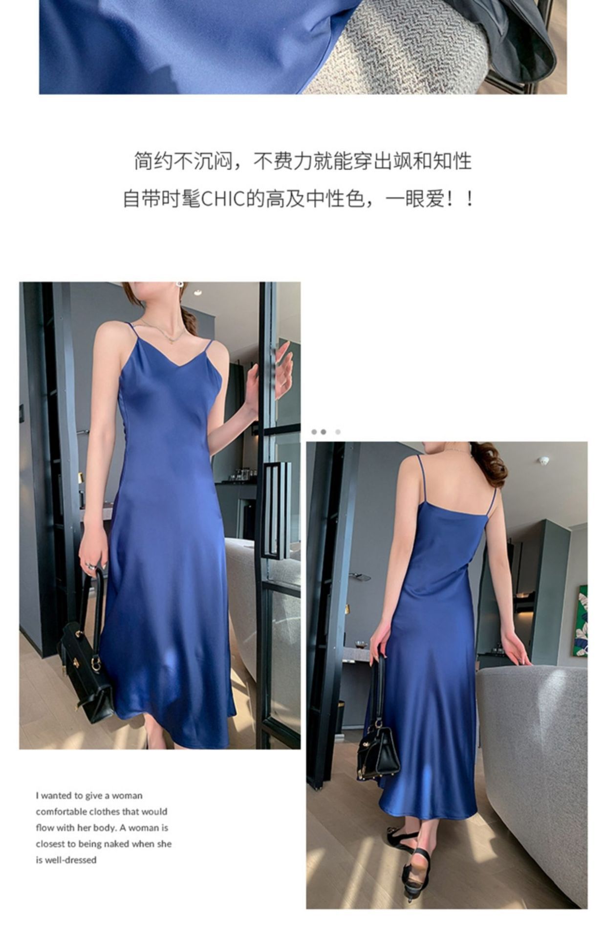 真丝缎面吊带连衣裙女法式春秋中长款a字打底裙薄款修身丝绸V领夏