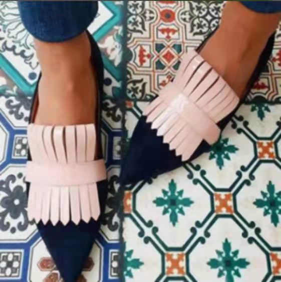 소원 크로스 보더 대외 무역 대형 신발 여성용 여름 새로운 뾰족한 색상 분할 하프 슬리퍼 겉옷 플랫 샌들스토어 가기