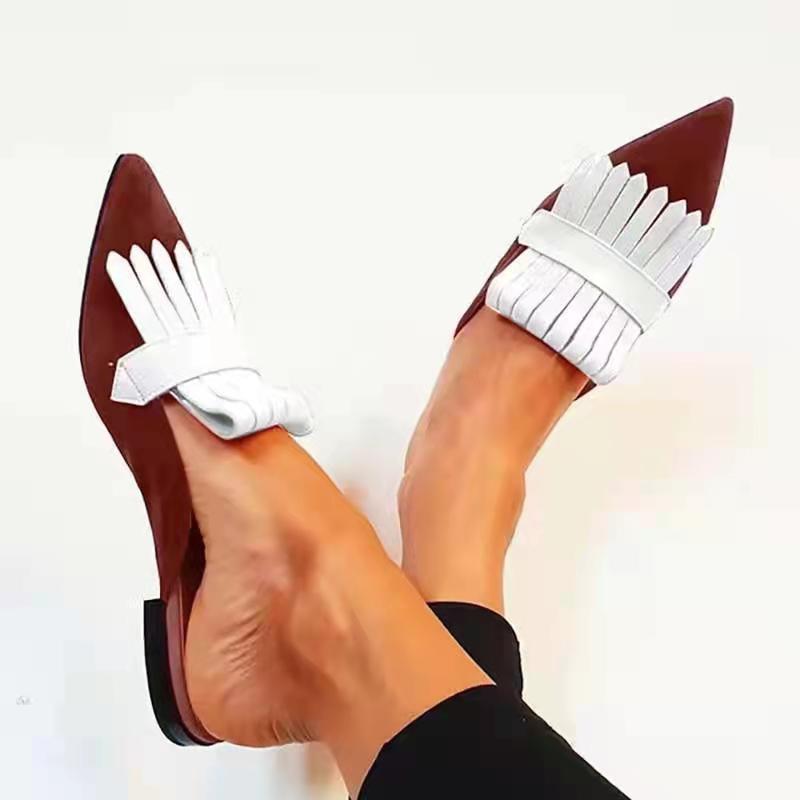 소원 크로스 보더 대외 무역 대형 신발 여성용 여름 새로운 뾰족한 색상 분할 하프 슬리퍼 겉옷 플랫 샌들