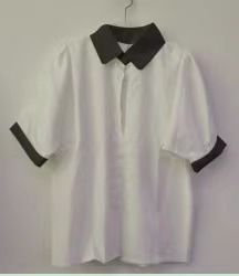 蓝白条纹配上白色的领子 撞色翻领有修饰脸型的作用 袖子也是做了泡泡袖的设计