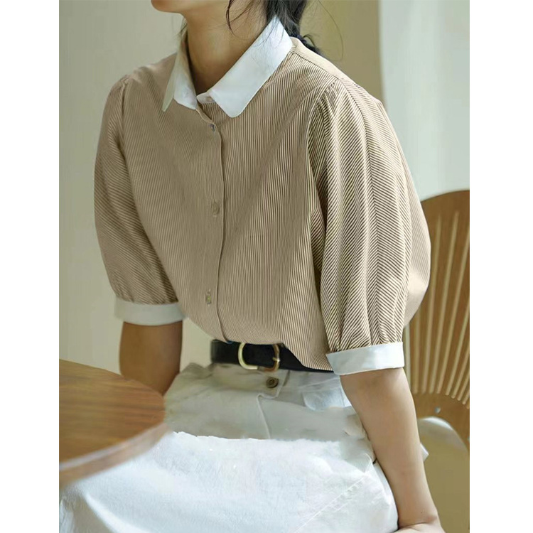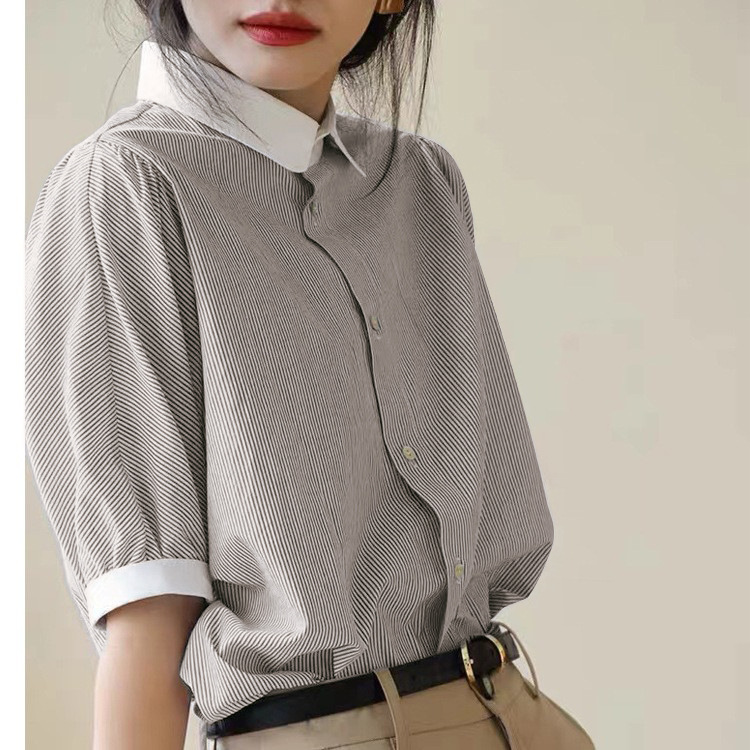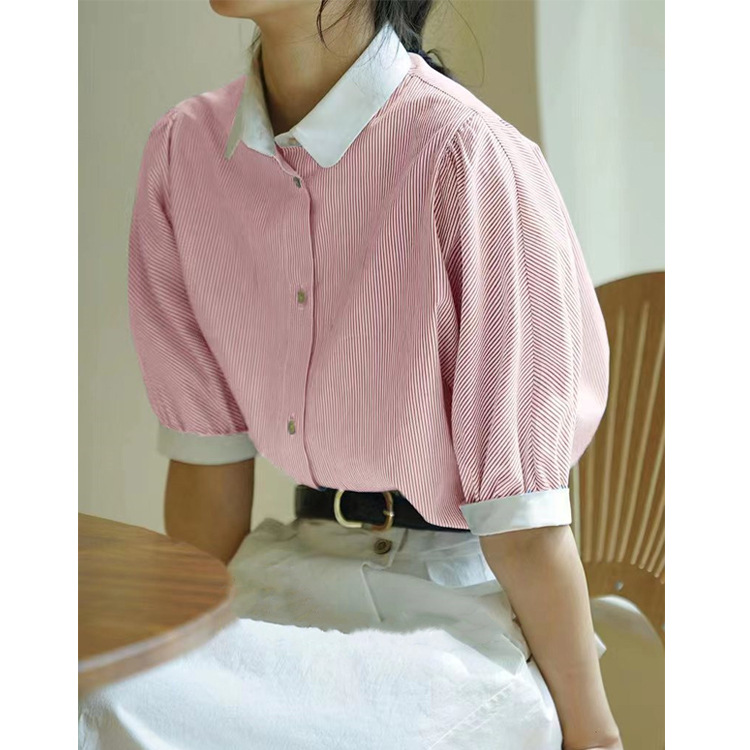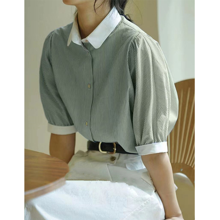 프렌치 틈새 디자인 센스 파란색과 흰색 스트라이프 셔츠 여성용 여름 새로운 반팔 퍼프 슬리브 우아한 대비 셔츠 10 색스토어 가기