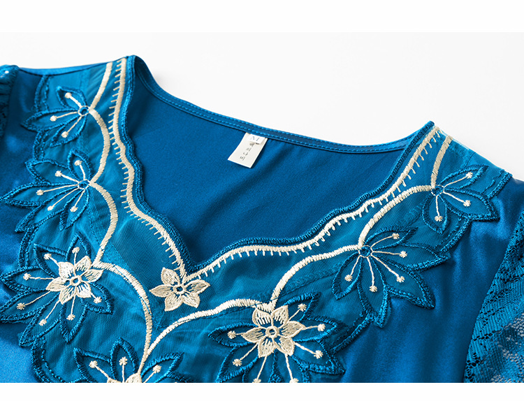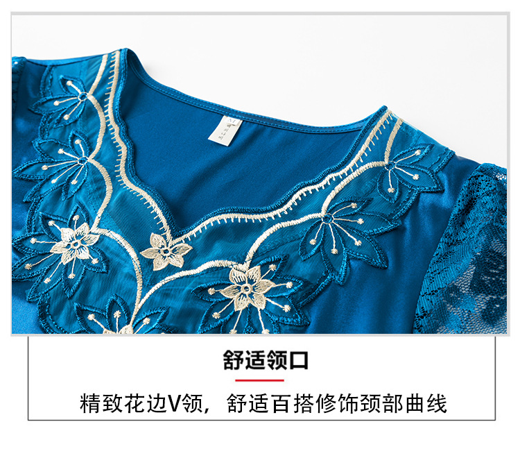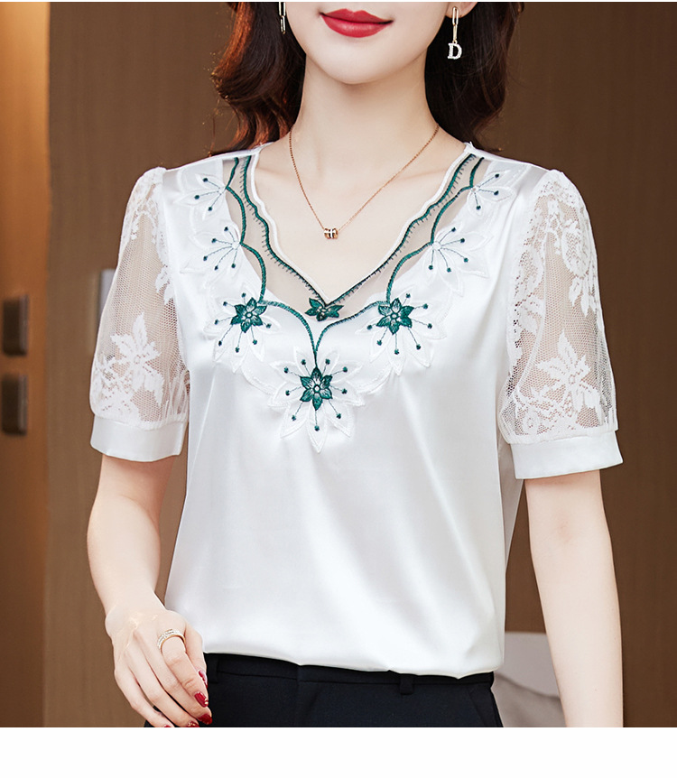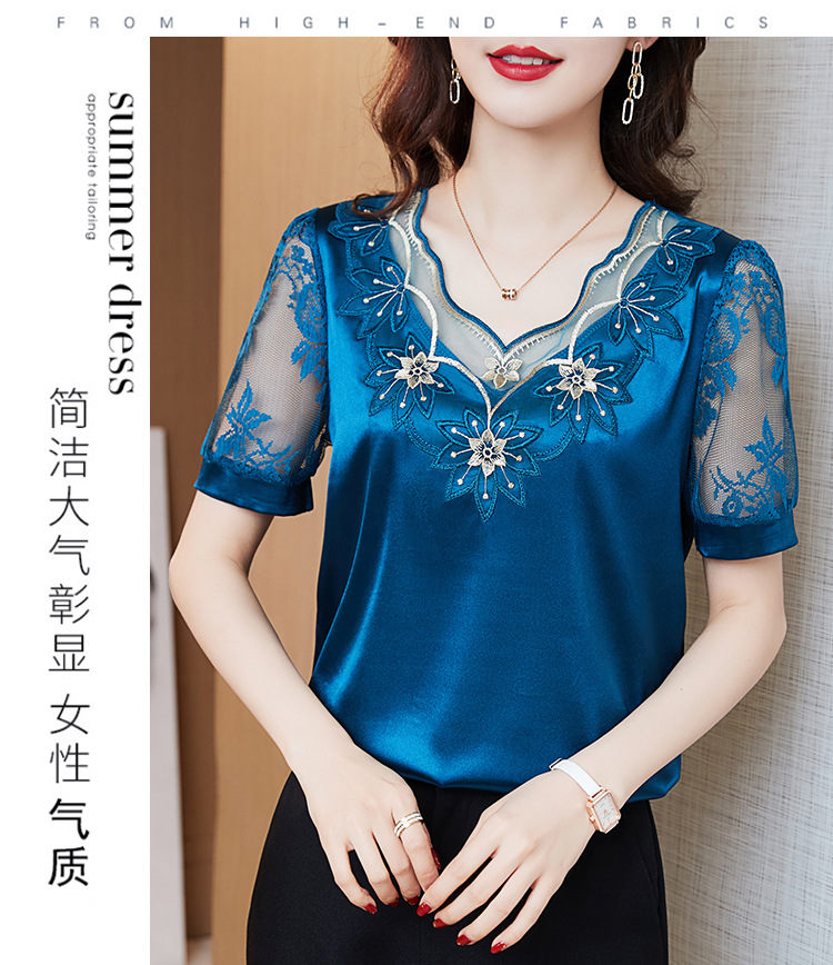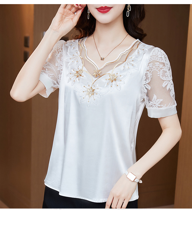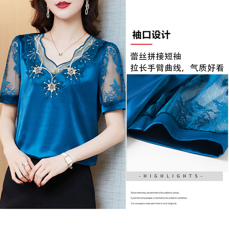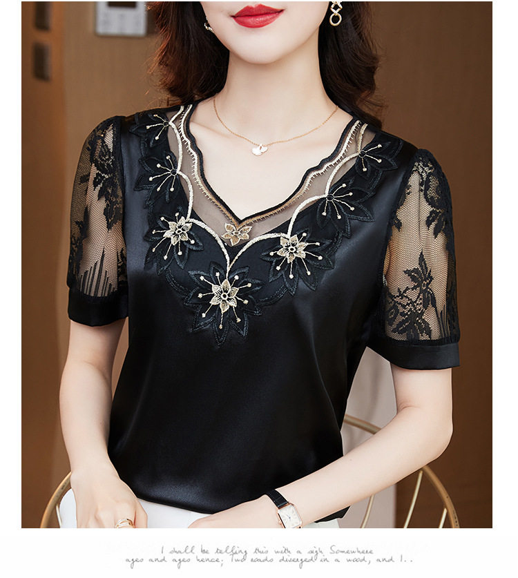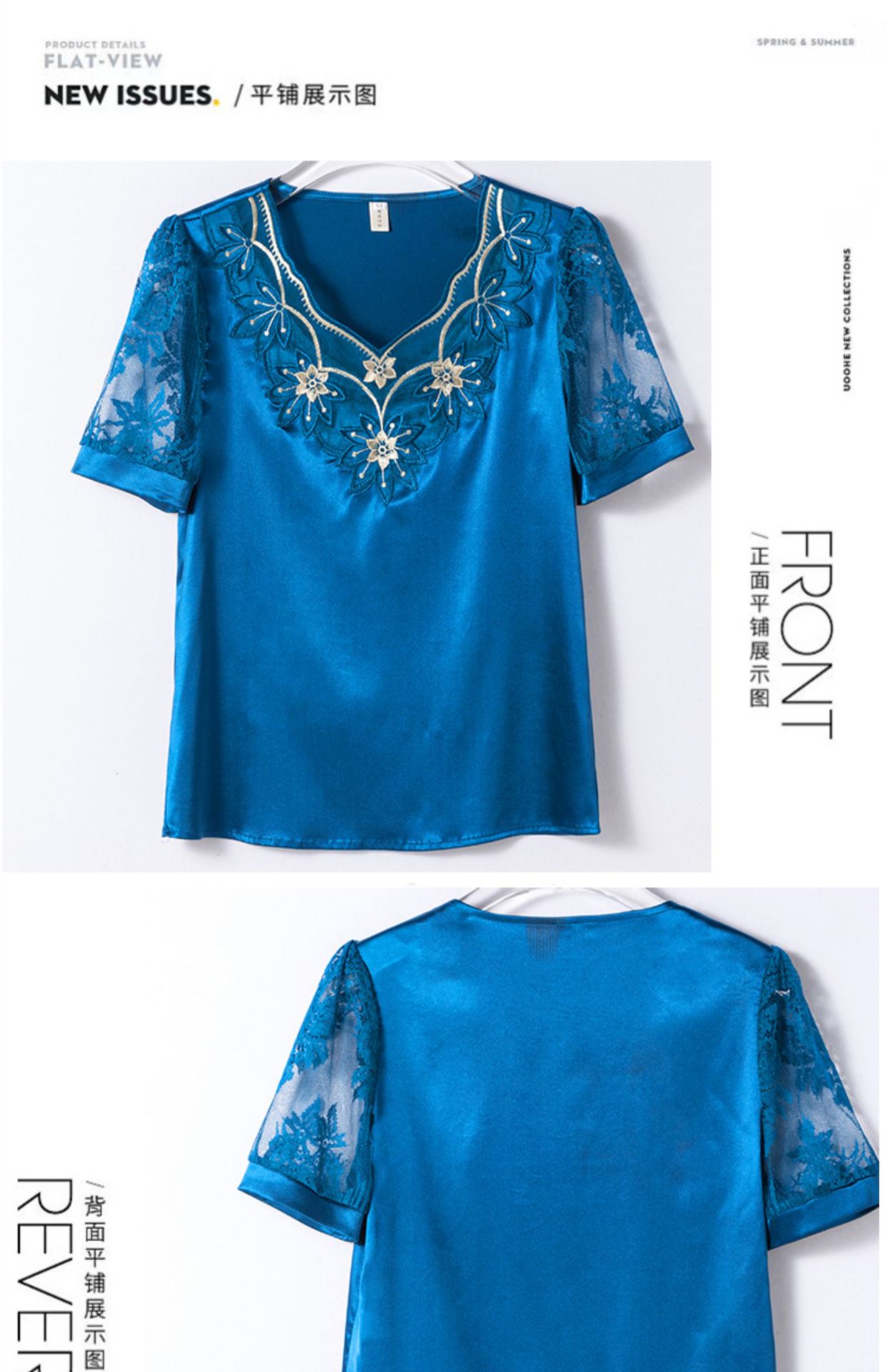 빅사이즈 우아한 신축성 있는 새틴 레이스 스티치 이너웨어 겸용 반팔 쉬폰 셔츠 여성용 2025 여름 신축성 있는 슬림핏스토어 가기
