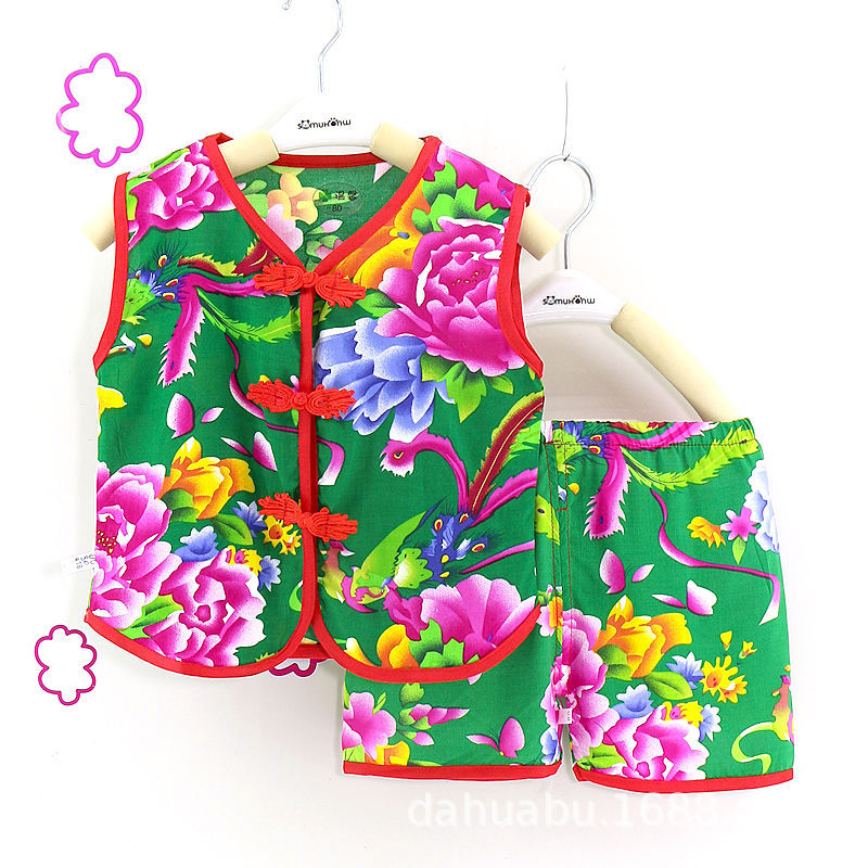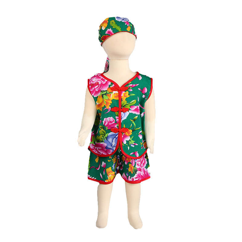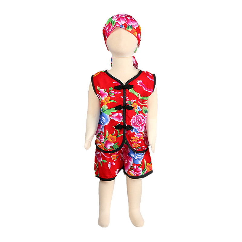 중국 스타일 꽃 옷면 실크 홈 의류 민소매 국가 스타일 어린이 양복 조끼 세트 머리 스카프 멋진 전자 상거래 공급스토어 가기