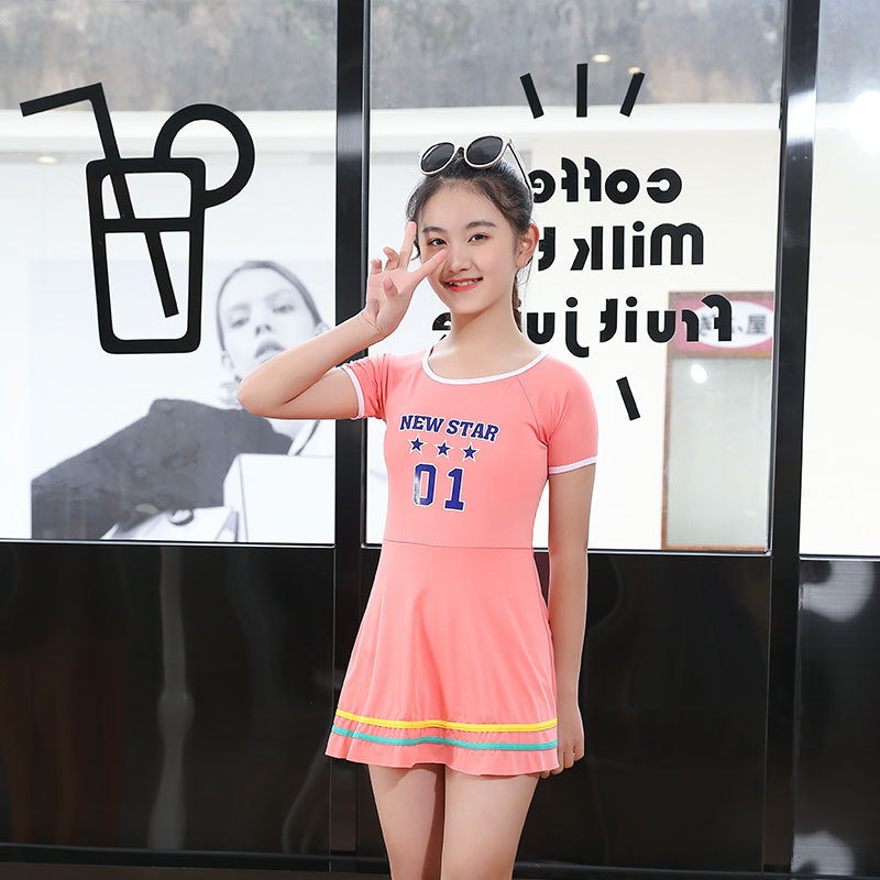 Jiyang 어린이 수영복 여아 원피스 스커트 수영복 반팔 귀여운 중대형 어린이 소녀 간단한 스포츠 수영복스토어 가기