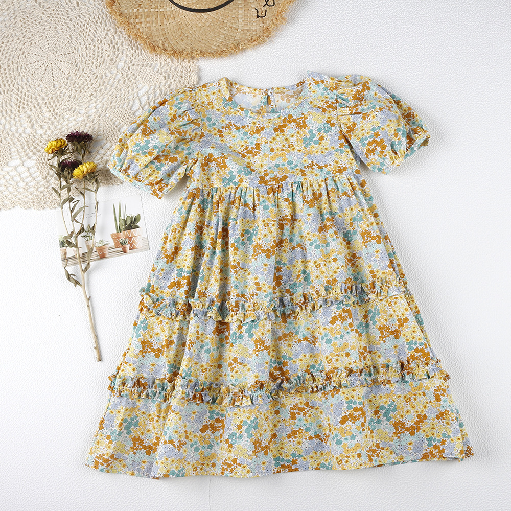 크로스 보더 4 색 유럽과 미국 어린이 원피스 꽃 긴 원피스 면 인쇄 주름 레이스 버블 슬리브스토어 가기