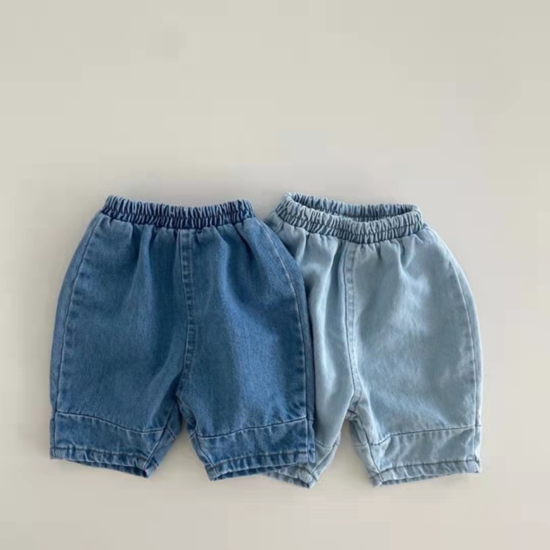 한국 스타일 유아용 루즈핏 부드러운 데님 팬츠 봄 여름 심플하고 다재다능한 캐주얼 팬츠 하이웨이스트 9부 팬츠 귀여운 아동복스토어 가기