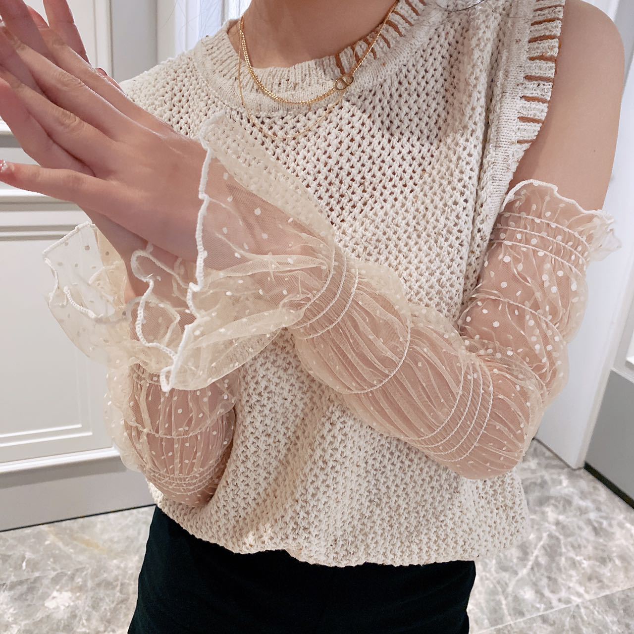 • 레이스 아이스 슬리브-베이지 웨이브 도트