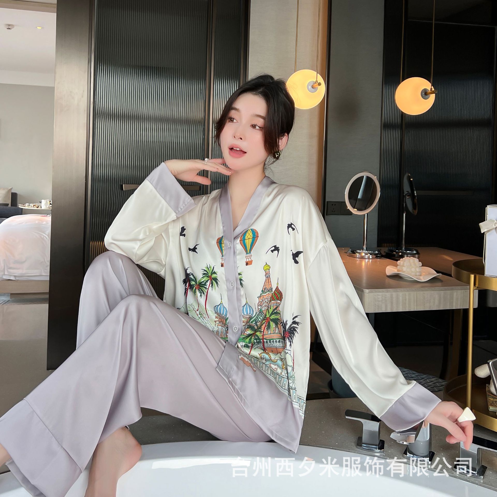 봄과 가을 아이스 실크 잠옷 여성용 인터넷 인기있는 긴팔 느슨한 서양 스타일 연령을 줄이는 실크 여름 의류