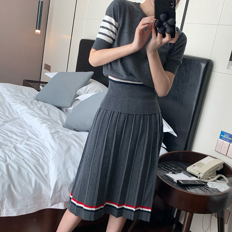 TB 2024 봄과 여름 새로운 아카데미 스타일 우아한 나이를 줄이는 슬림 핏 크루 넥 반팔 주름 치마 니트 세트 여성용스토어 가기