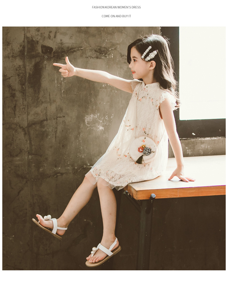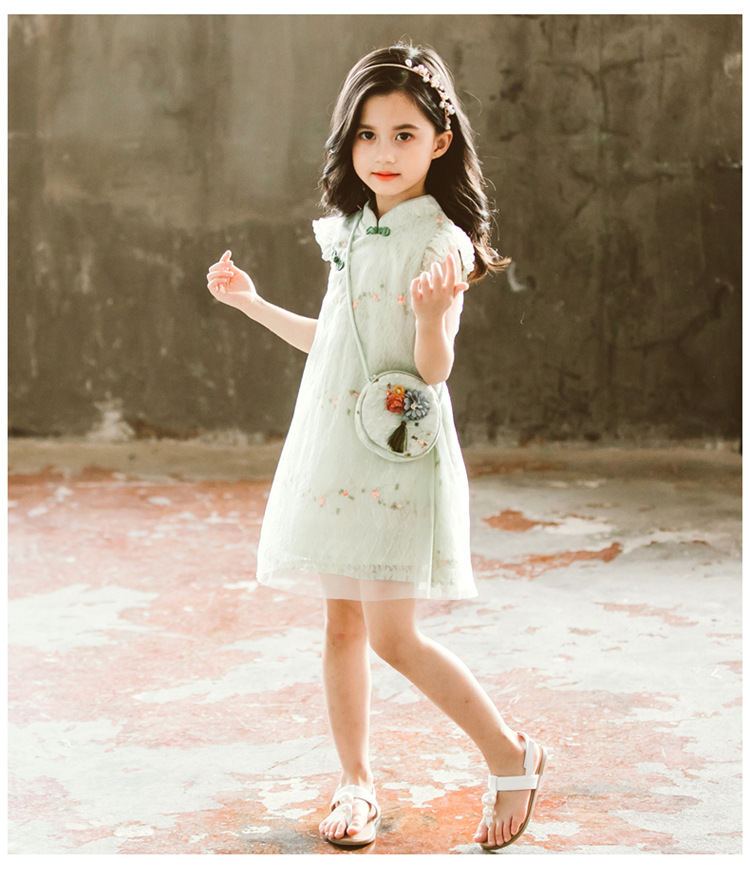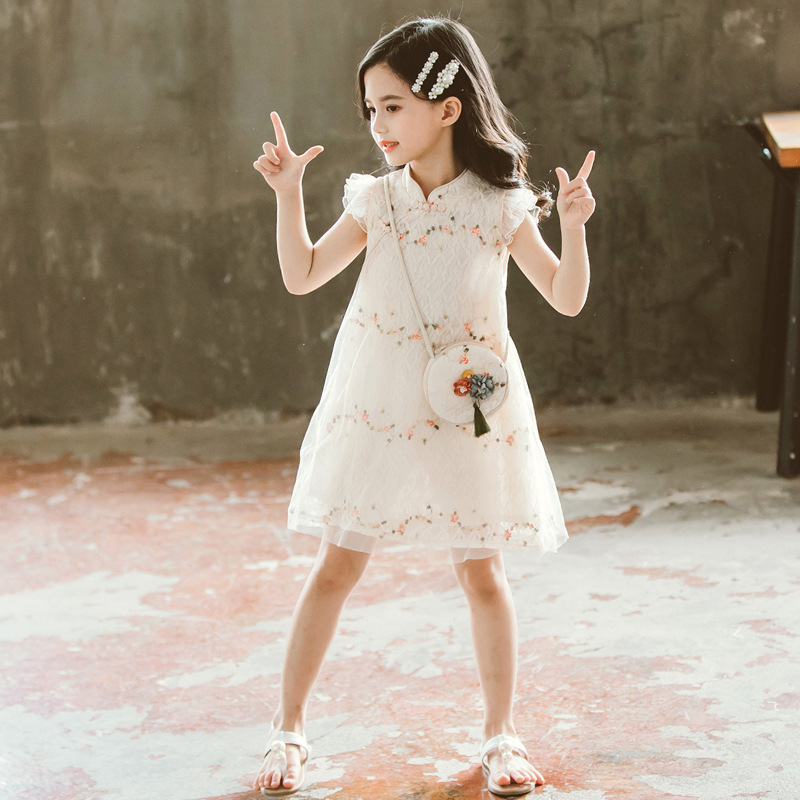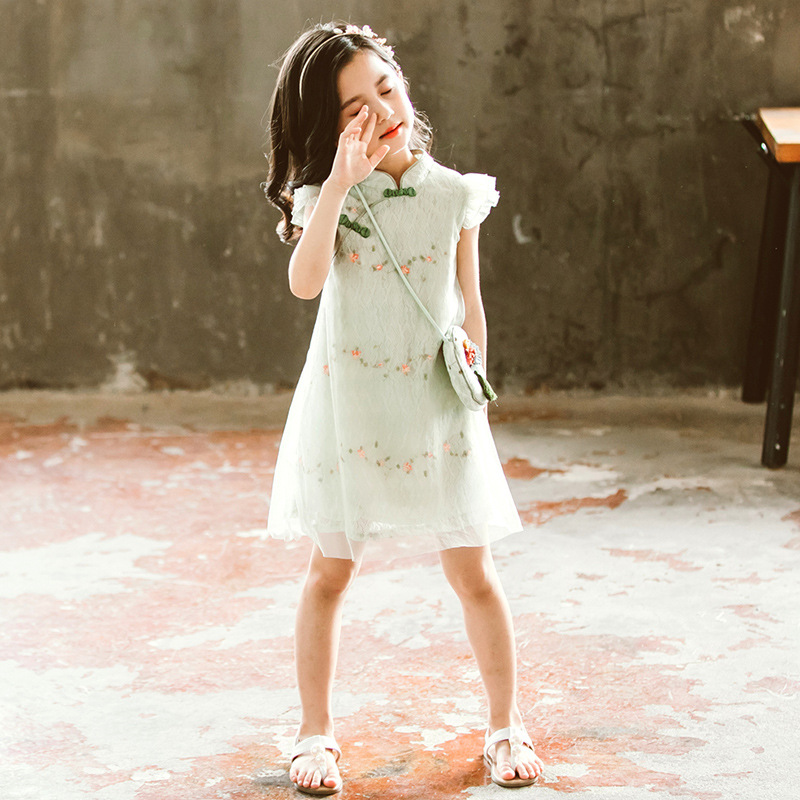 원피스 2023 새로운 국가 스타일 어린이 치마 소녀 여름 치파오 치마 어린이 레이스 머리카락의 세대