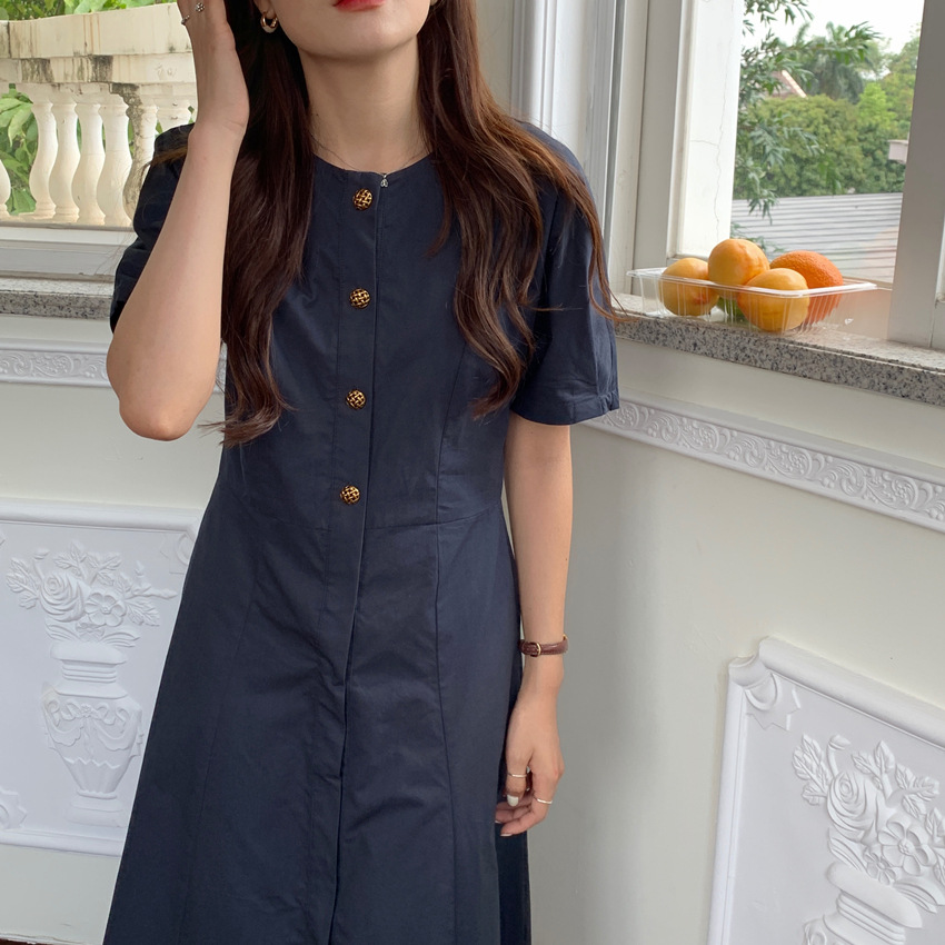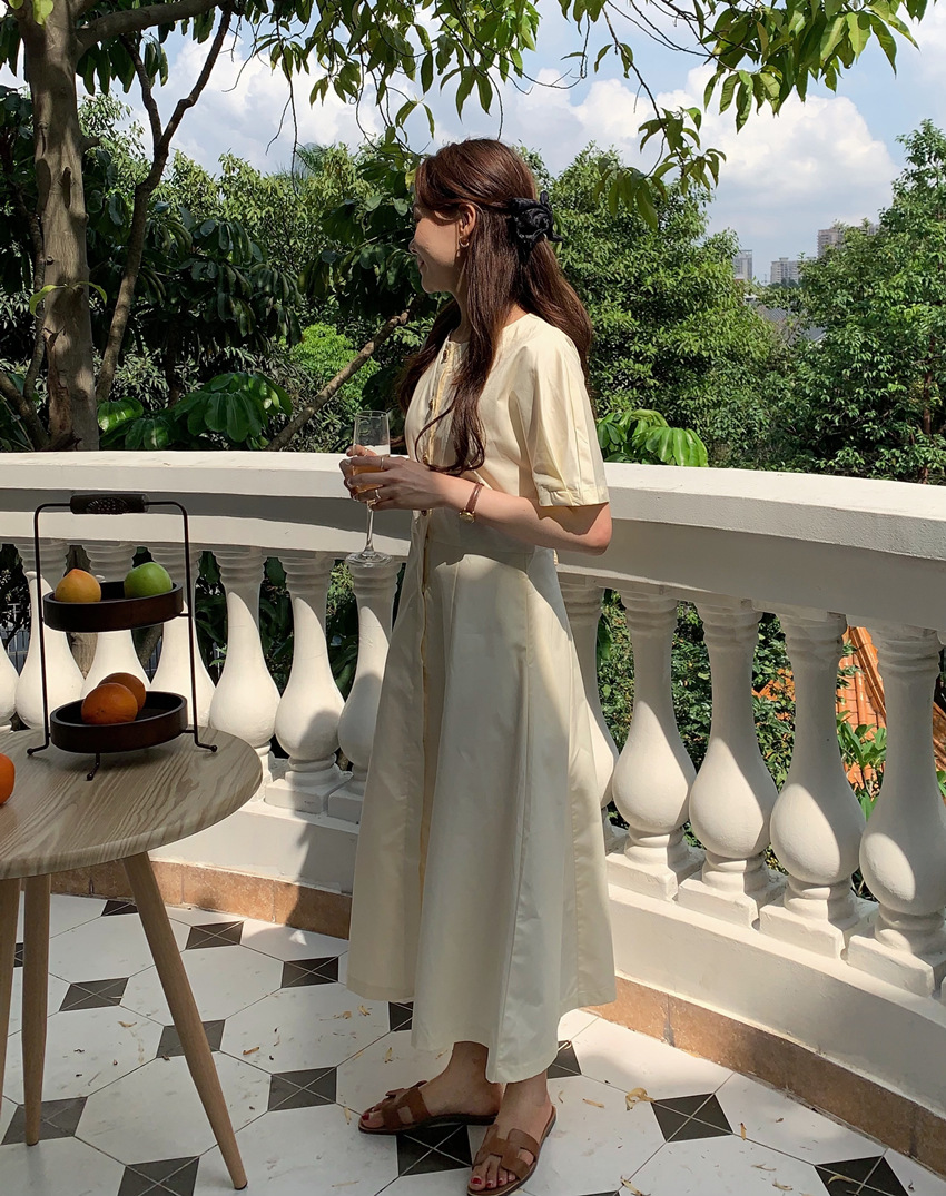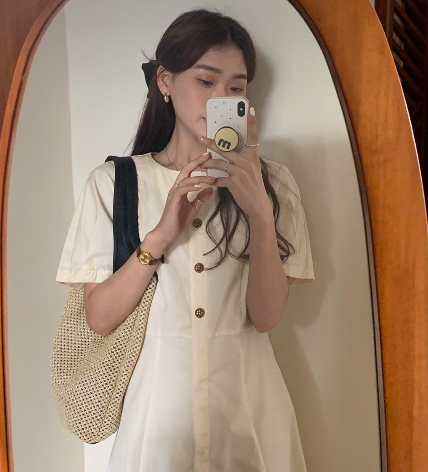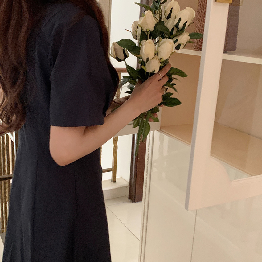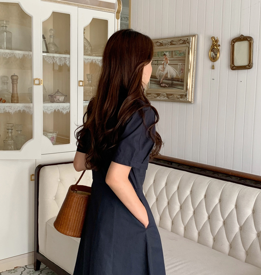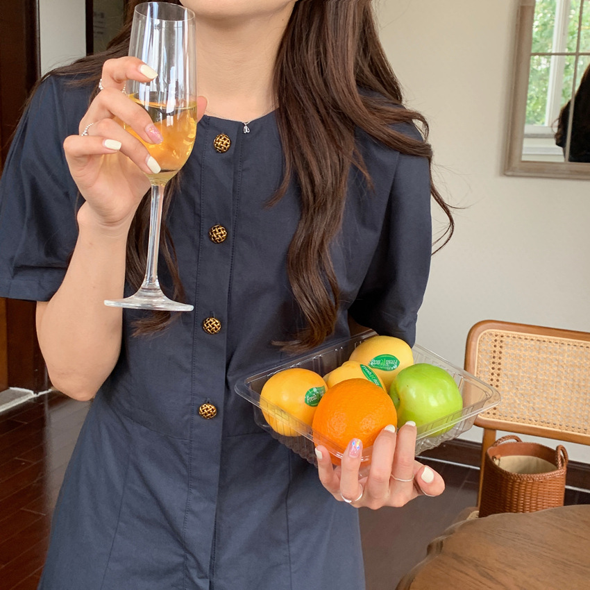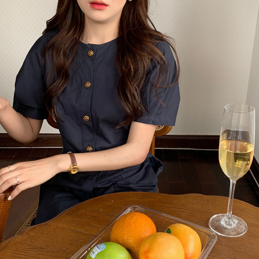 Real Shot 2025 봄 여름 새로운 한국 프랑스 스타일 복고풍 틈새 세련된 싱글 브레스트 허리 슬리밍 드레스스토어 가기