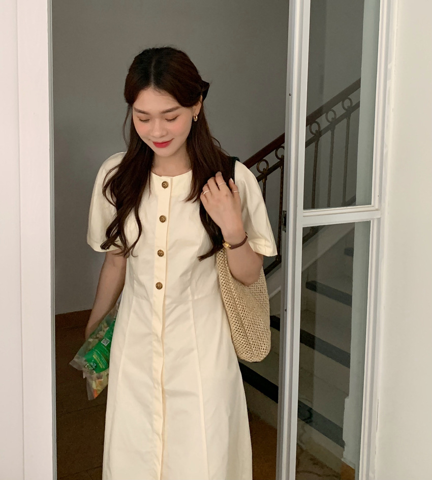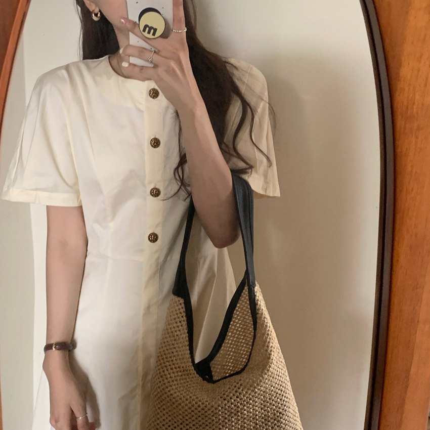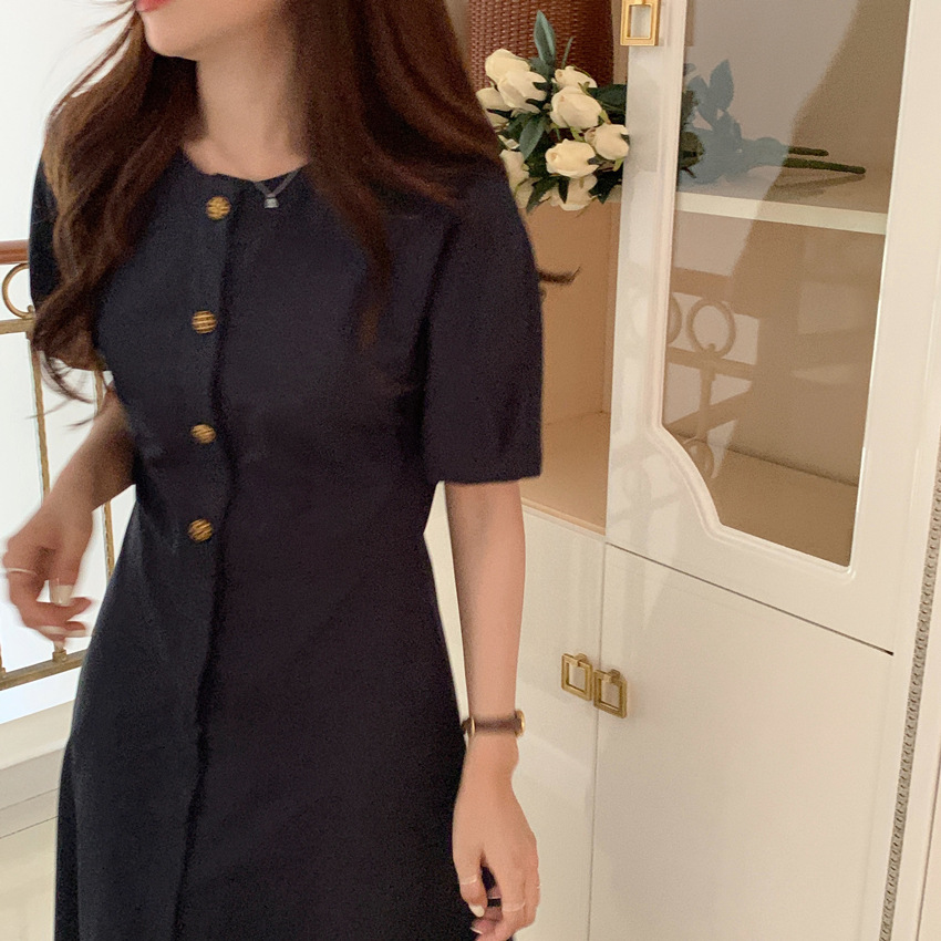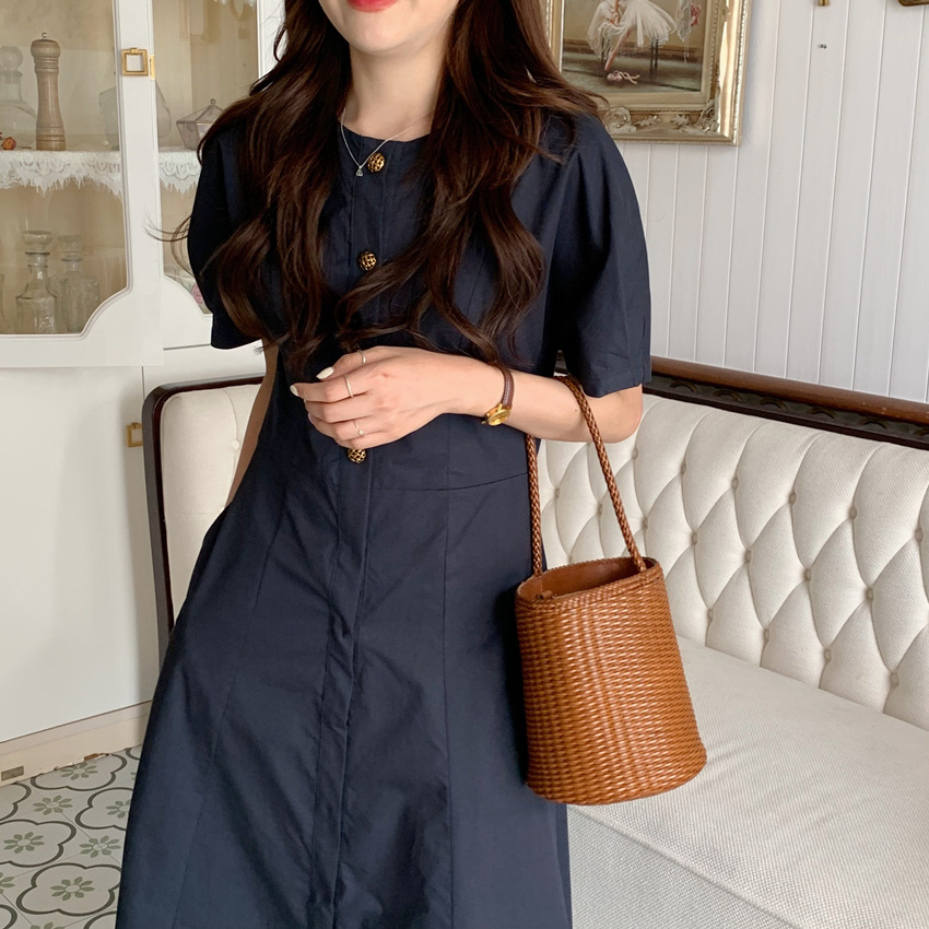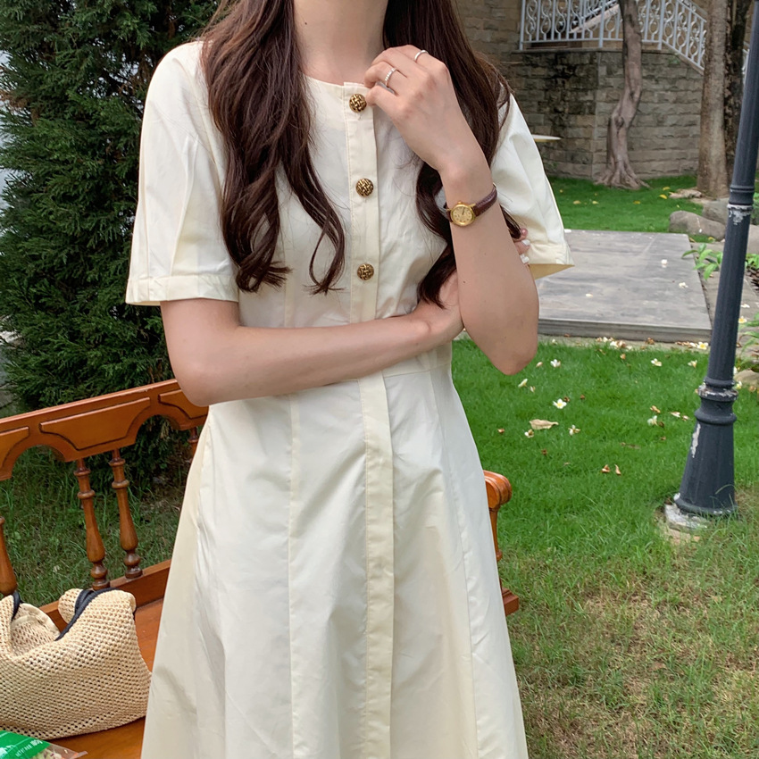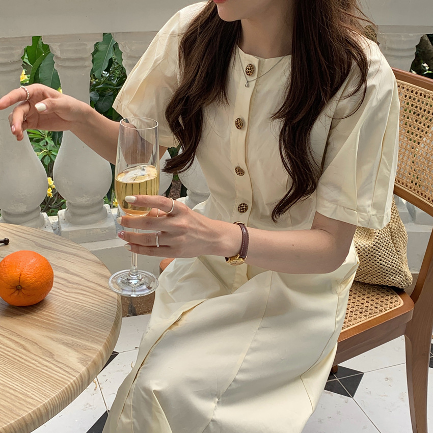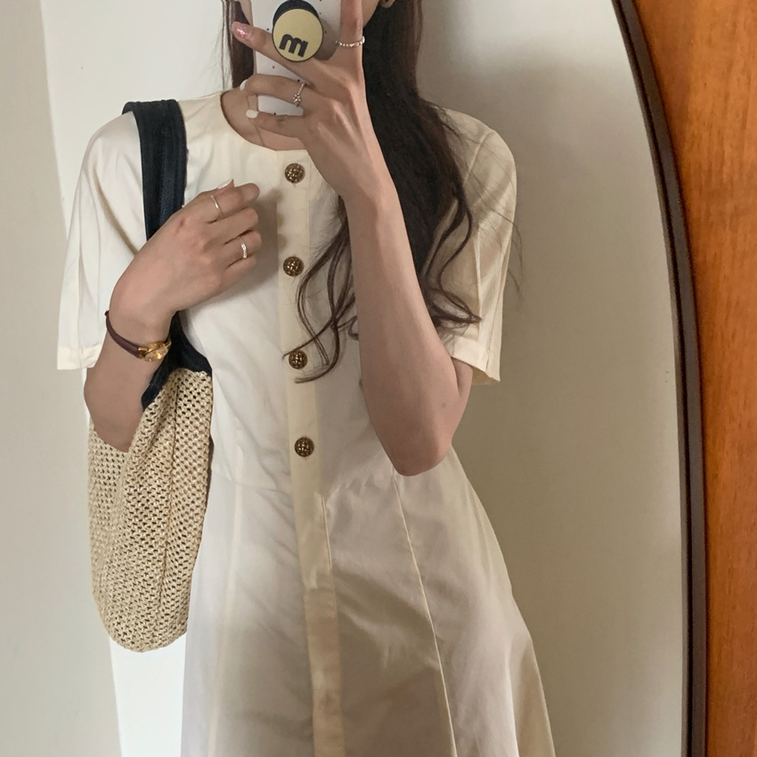 Real Shot 2025 봄 여름 새로운 한국 프랑스 스타일 복고풍 틈새 세련된 싱글 브레스트 허리 슬리밍 드레스