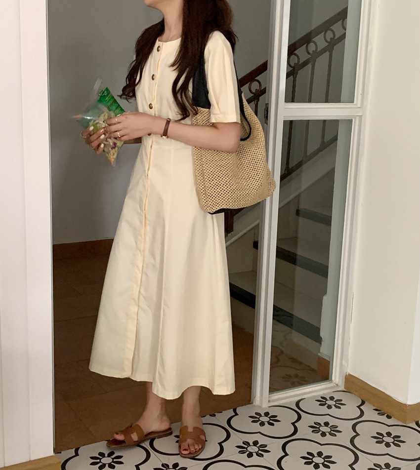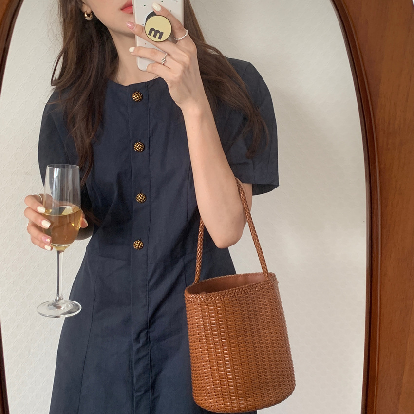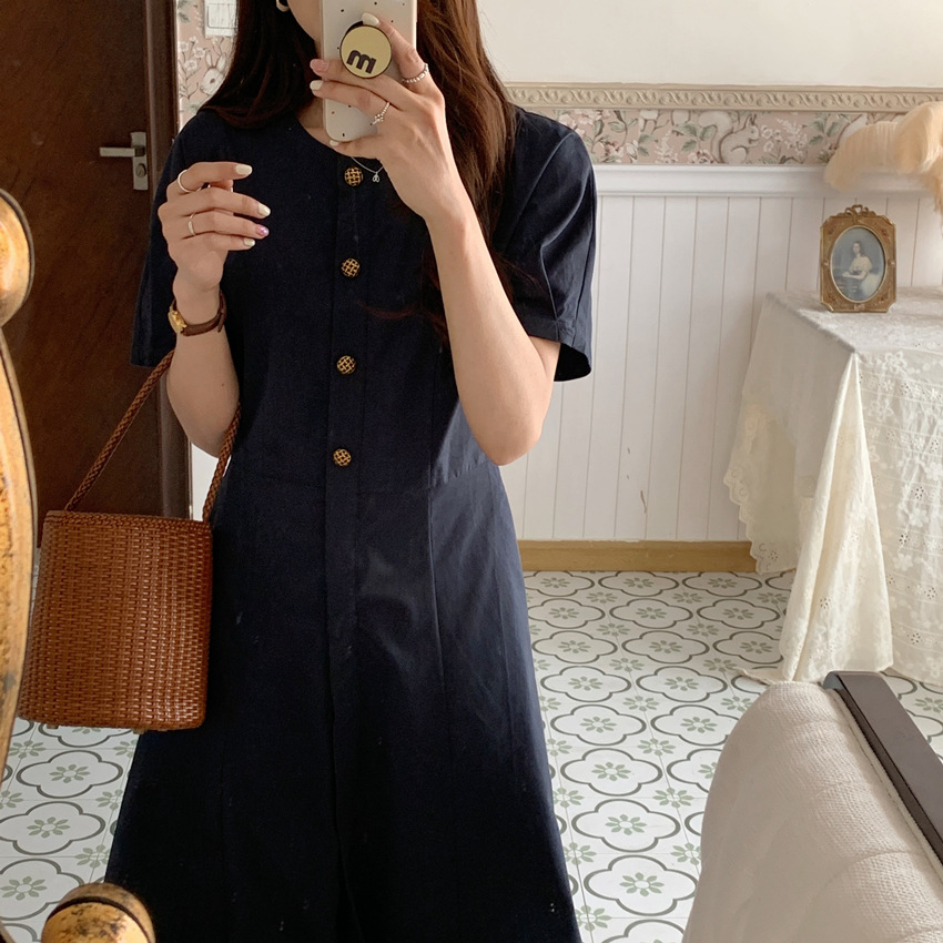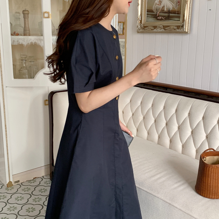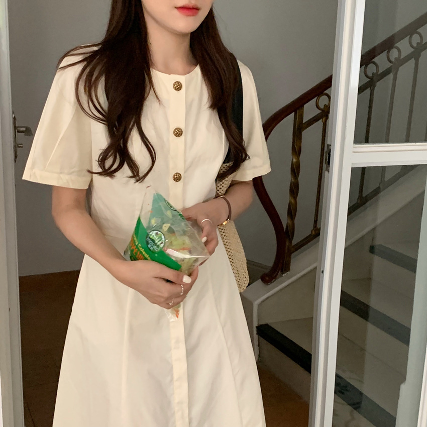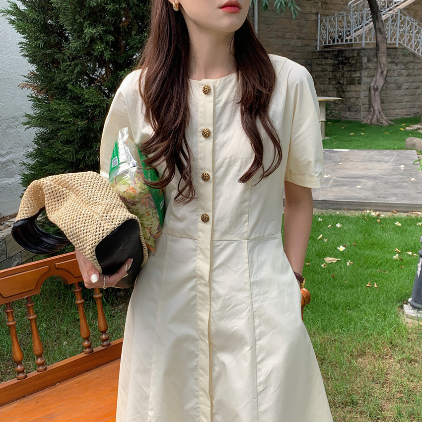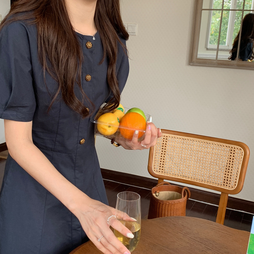 Real Shot 2025 봄 여름 새로운 한국 프랑스 스타일 복고풍 틈새 세련된 싱글 브레스트 허리 슬리밍 드레스
