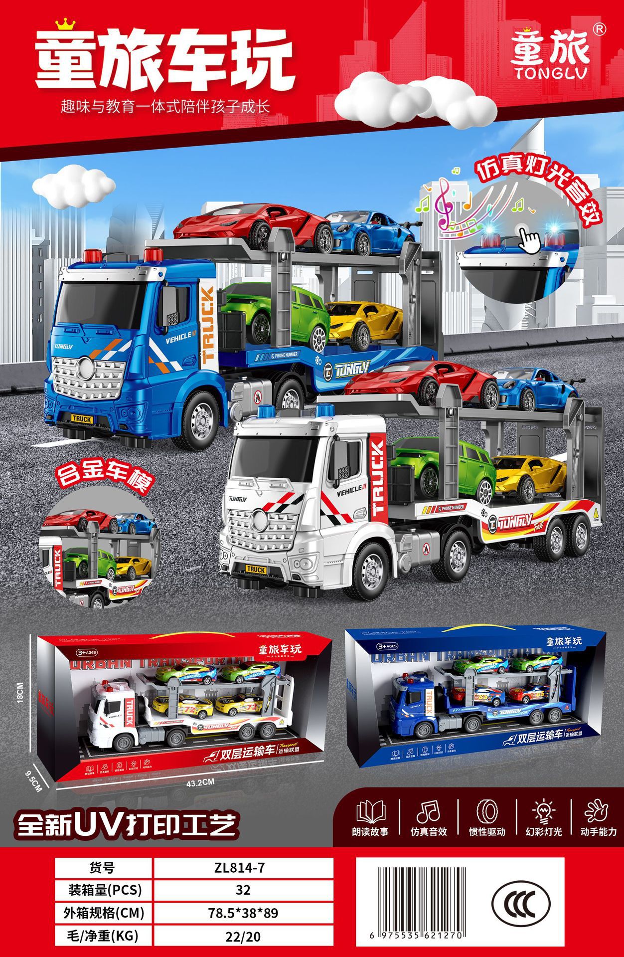 • ZL814-7 사운드 & 라이트 뮤직 2층 운송 트럭 (2가지 색상 혼합 발송)