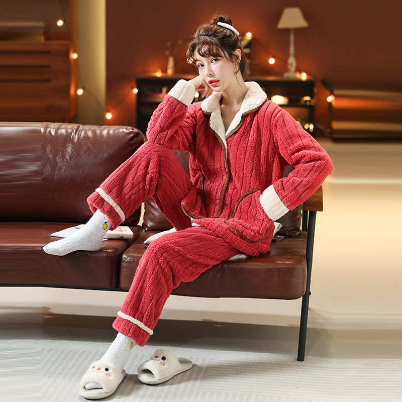 머리카락의 세대는 잠옷 여성의 가을과 겨울 플란넬 잠옷 패딩 옷깃 커플 가정 옷 밖에서 착용 할 수 있습니다 세트스토어 가기