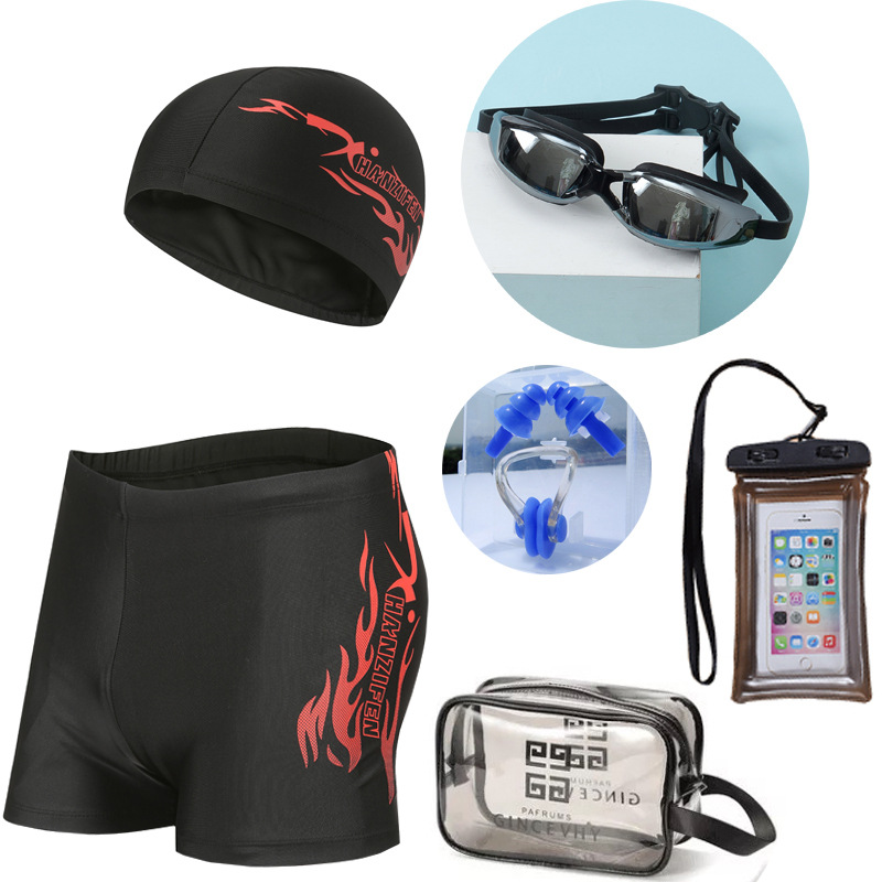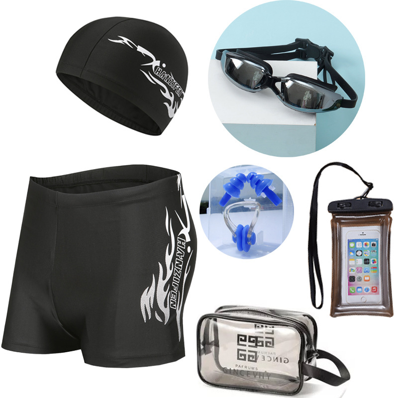 套装包含:泳裤+泳帽+鼻夹耳塞+手机防水袋+收纳包