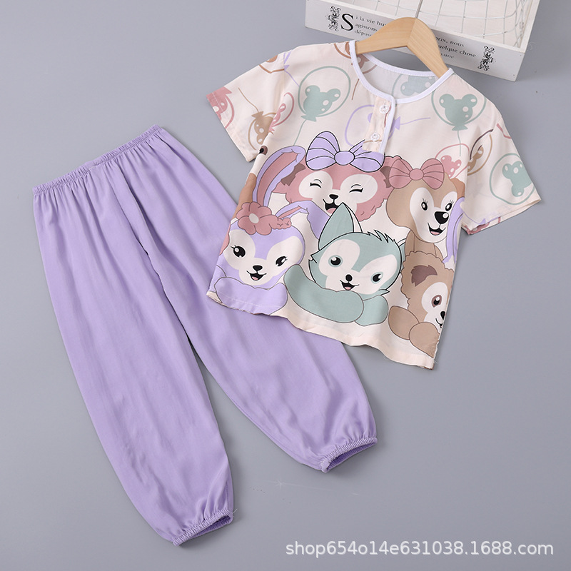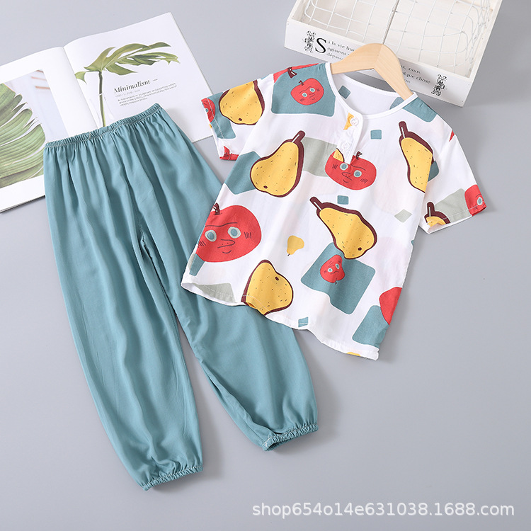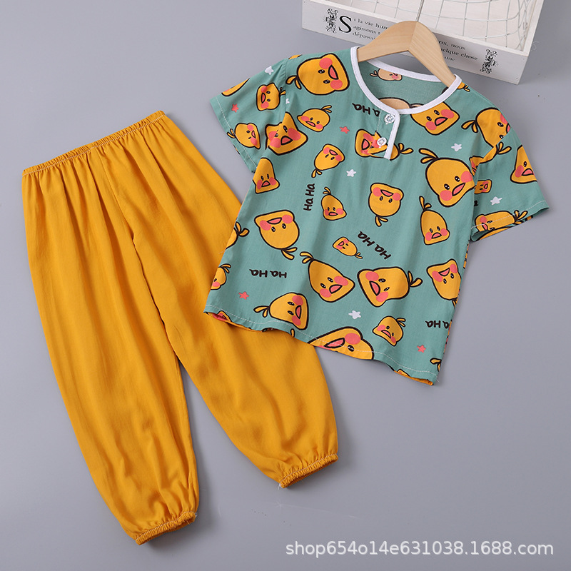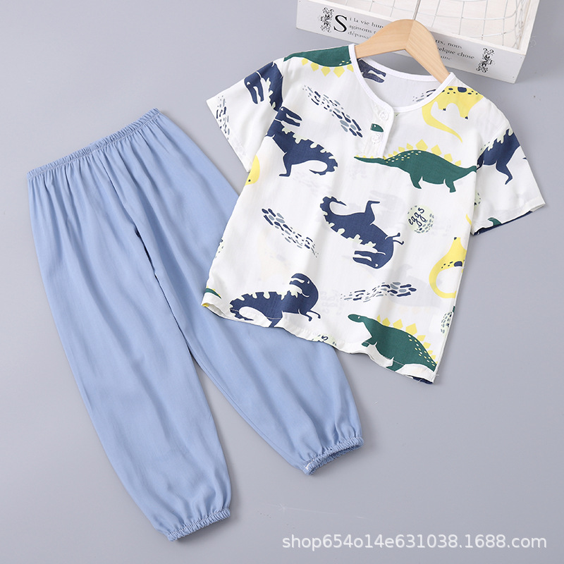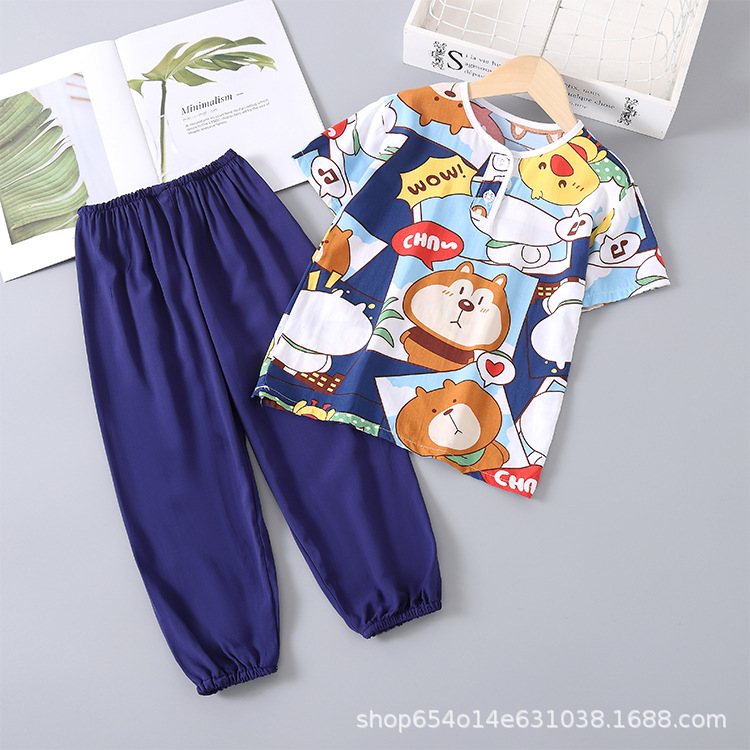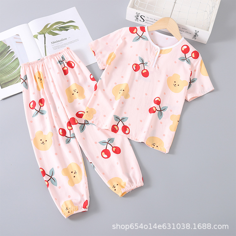 여름 어린이 반팔 인조 면 잠옷 면 실크 에어컨 의류 소년과 소녀 아기 얇은 실크 세트 여름스토어 가기