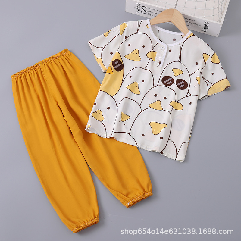 여름 어린이 반팔 인조 면 잠옷 면 실크 에어컨 의류 소년과 소녀 아기 얇은 실크 세트 여름