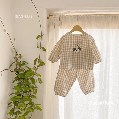 한국식 유아 아동복 봄과 여름 새로운 남성과 여성의 유아 세련된 격자 무늬 만화 캐주얼 탑 팬츠 세트스토어 가기