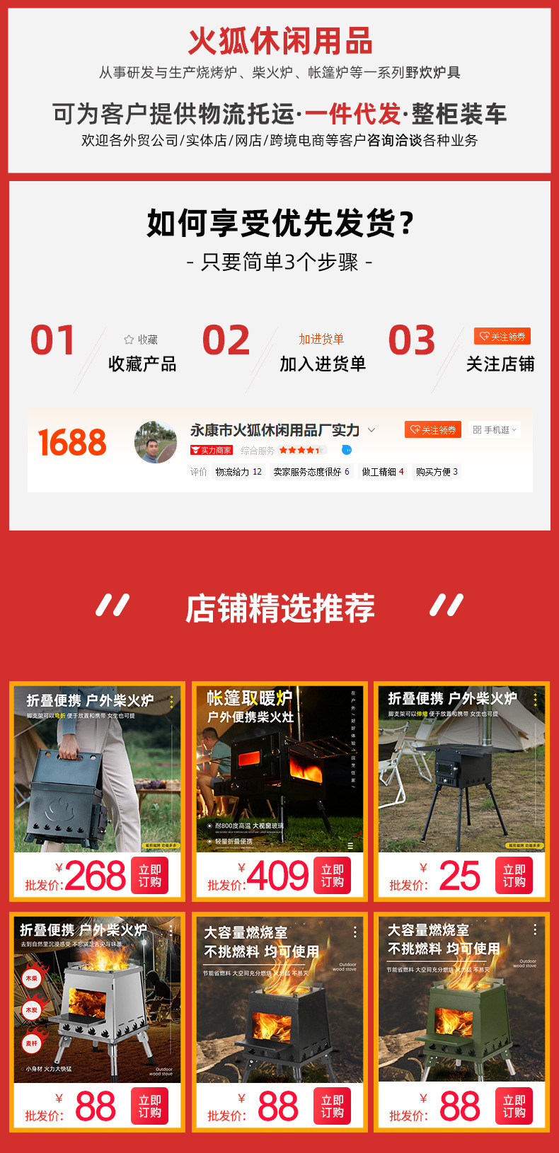 火狐休闲用品为一家专业从事研发与生产烧烤炉、柴火炉、帐篷炉等一系列野炊炉具的工厂。可为客户提供物流托运、一件代发、整柜装车。欢迎各外贸公司、实体店、网店、跨境电商等