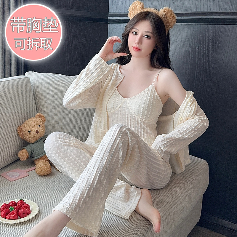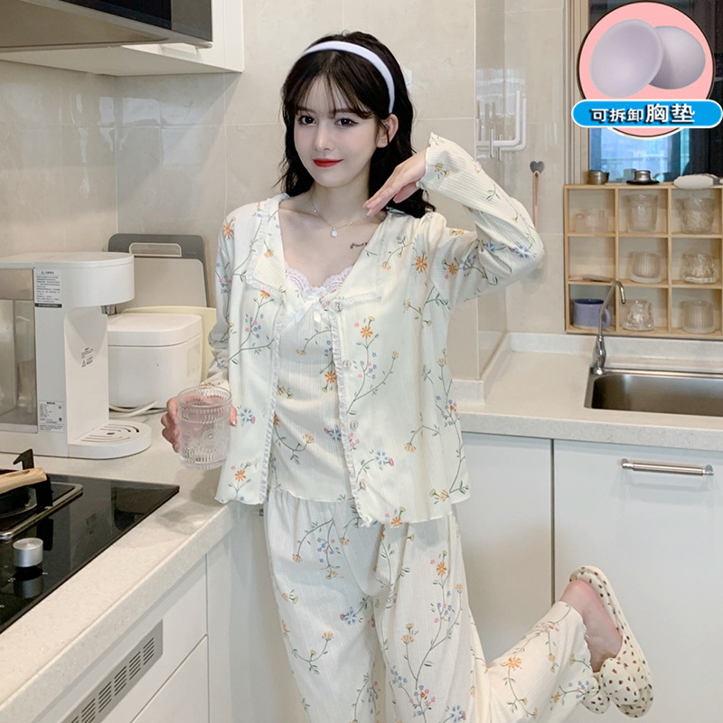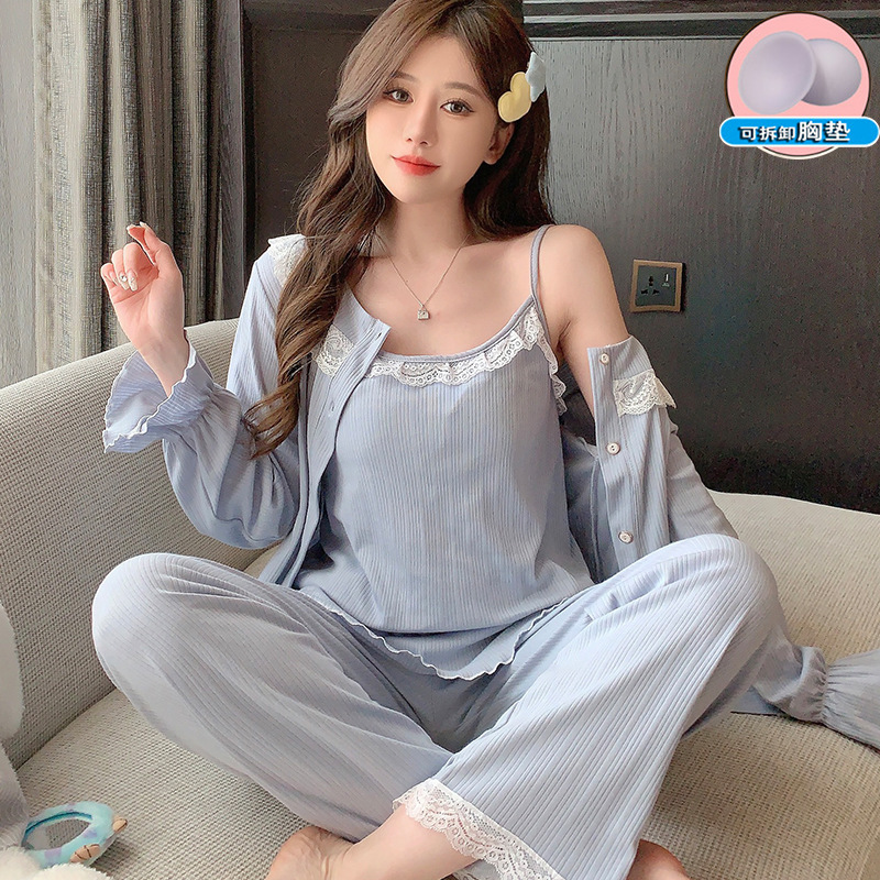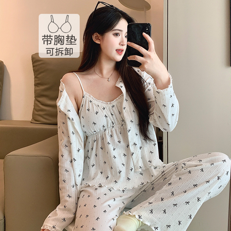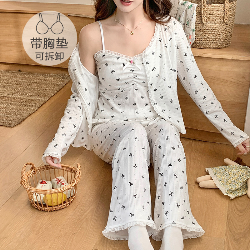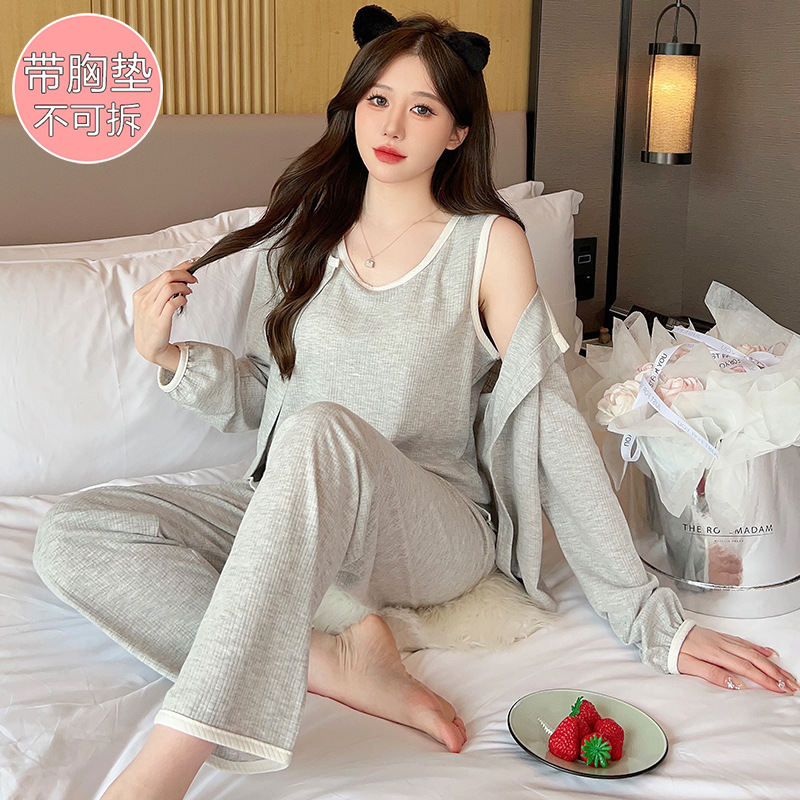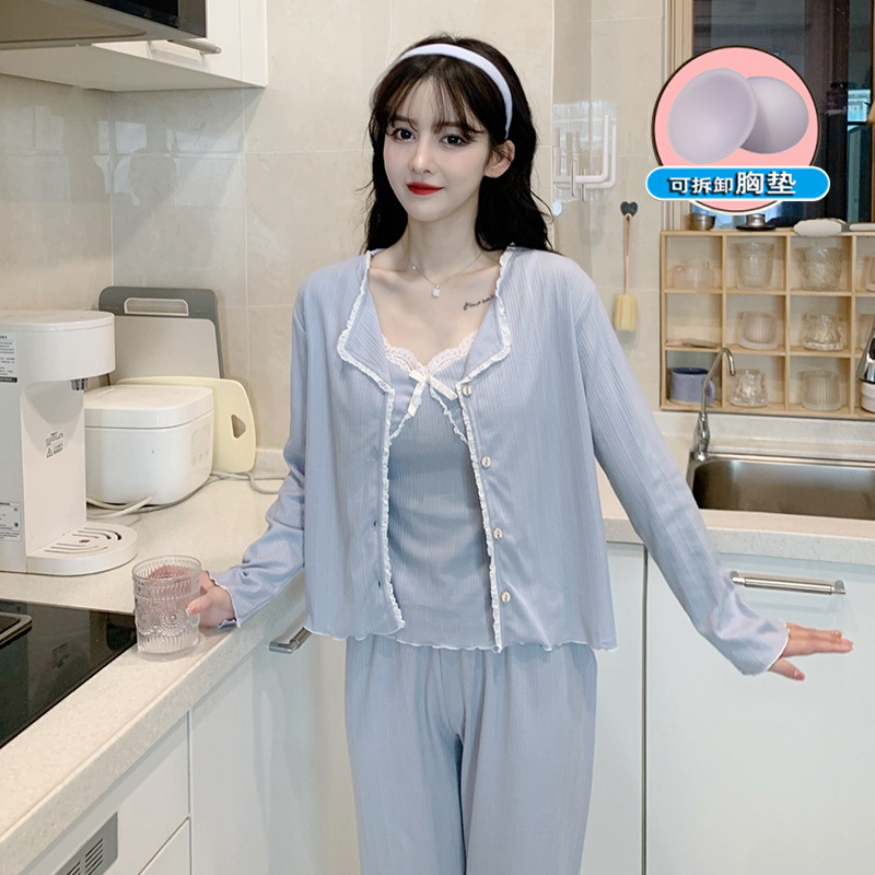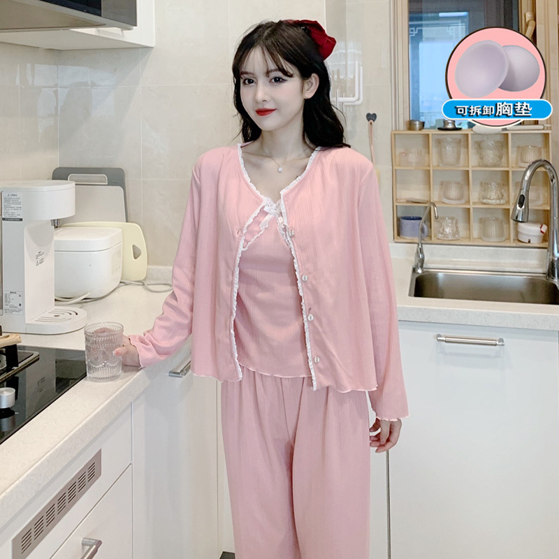 2025 봄 여름 신상 3종 세트 6535 면 패딩 탈착식 조끼 + 긴팔 + 바지 여성 잠옷