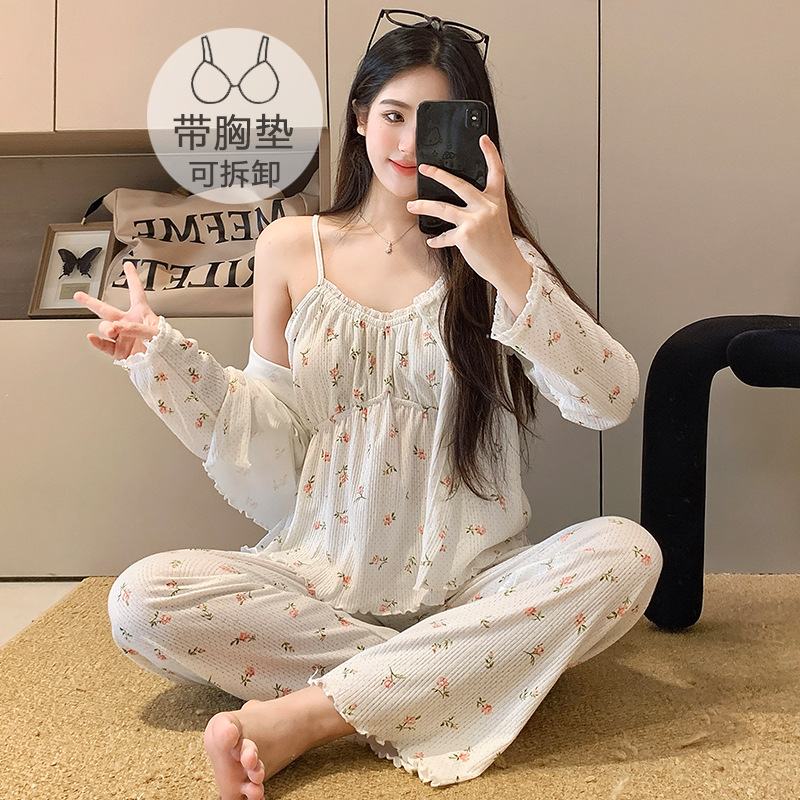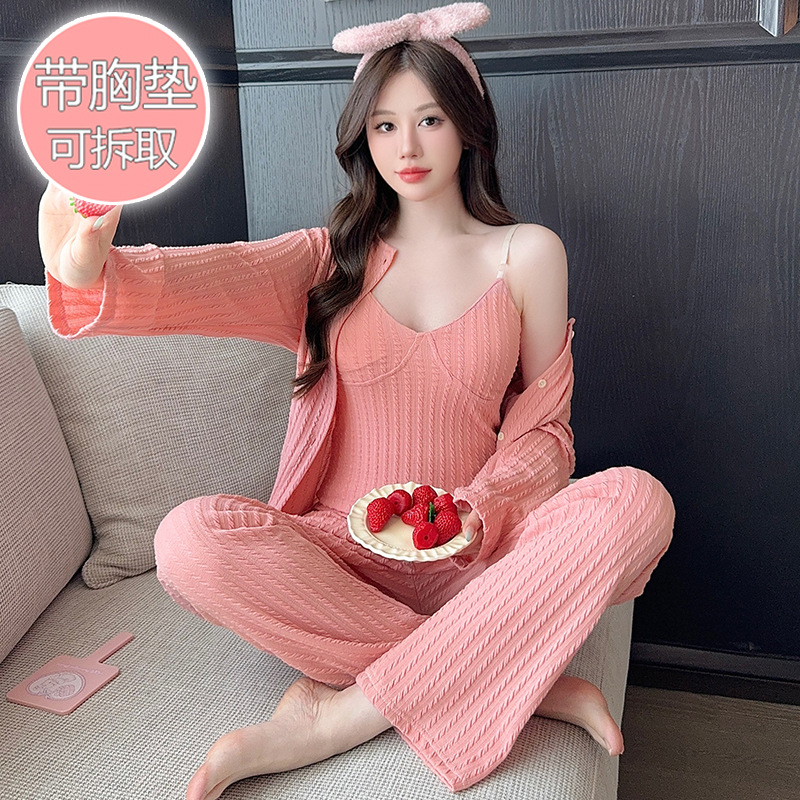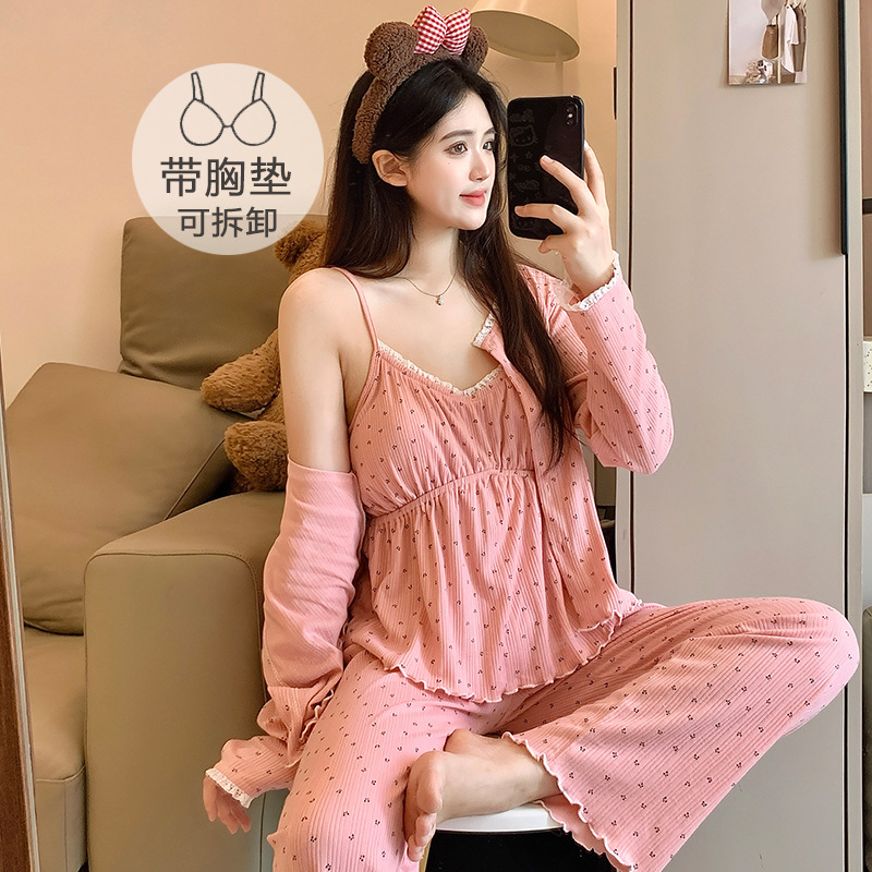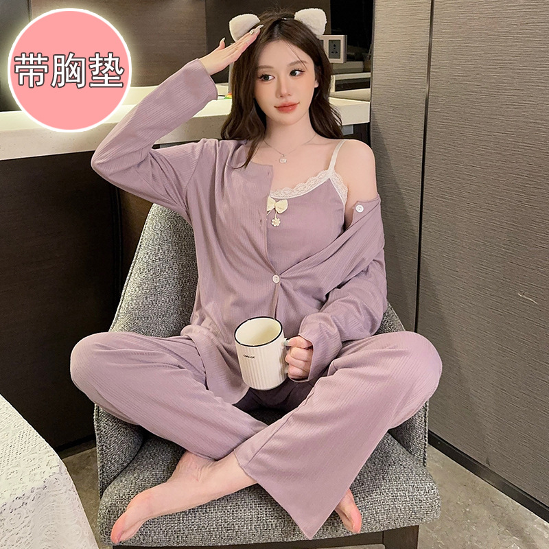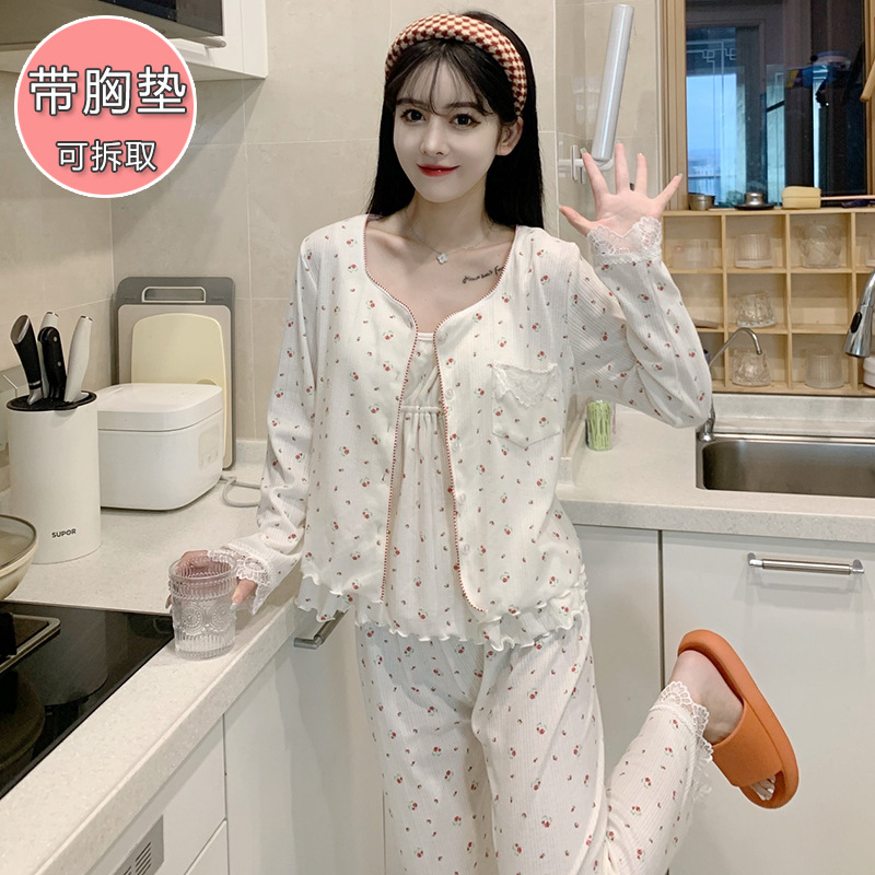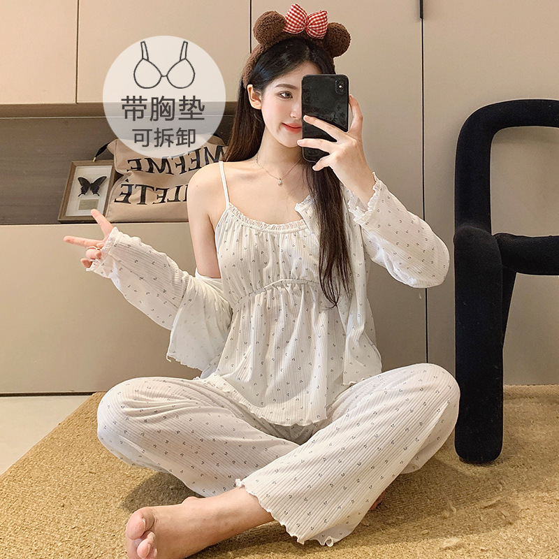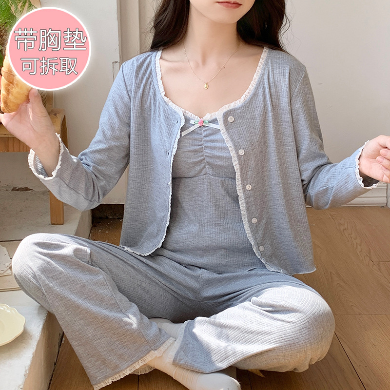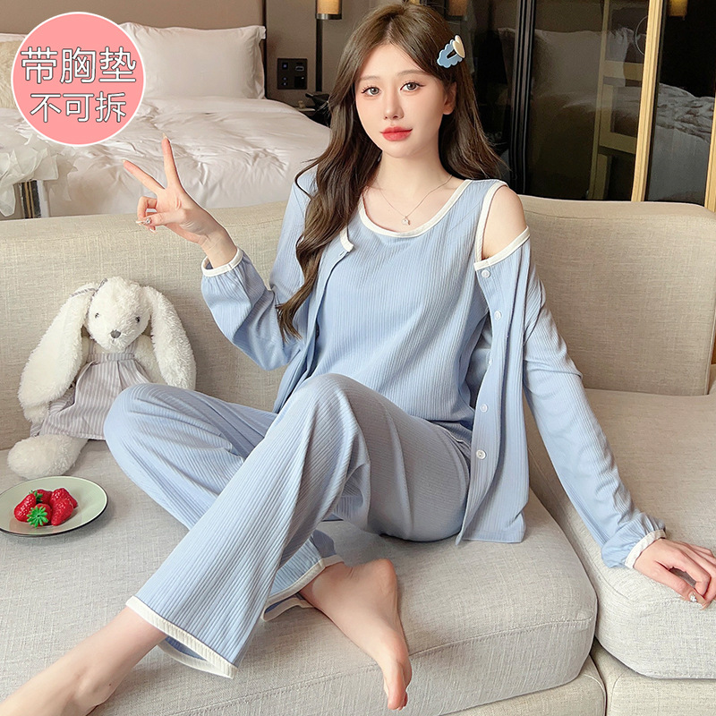 2025 봄 여름 신상 3종 세트 6535 면 패딩 탈착식 조끼 + 긴팔 + 바지 여성 잠옷