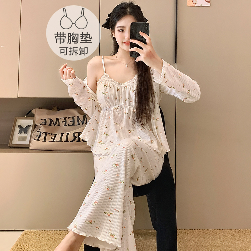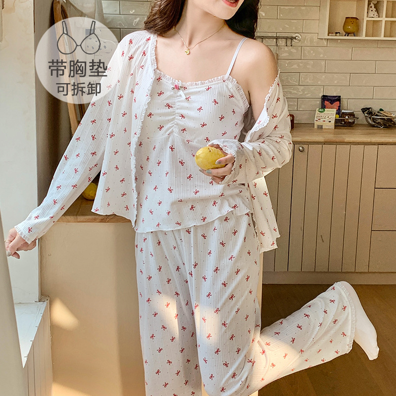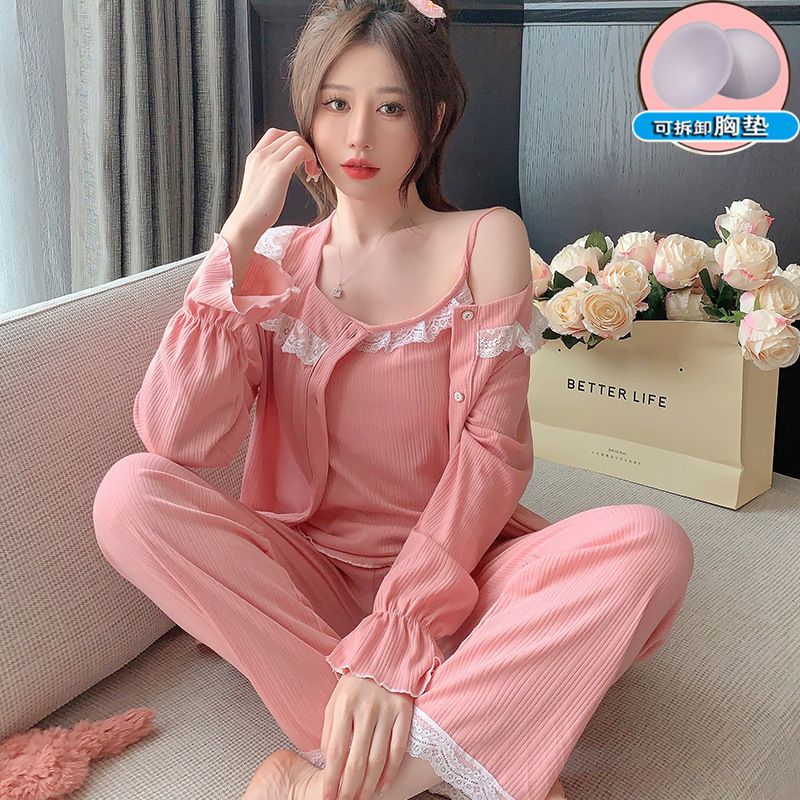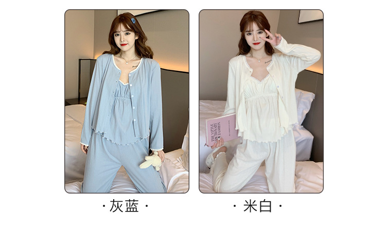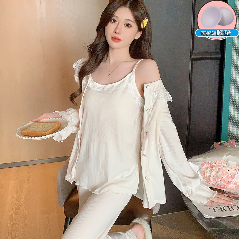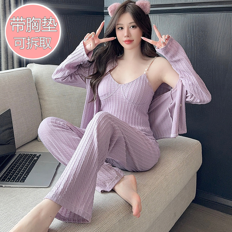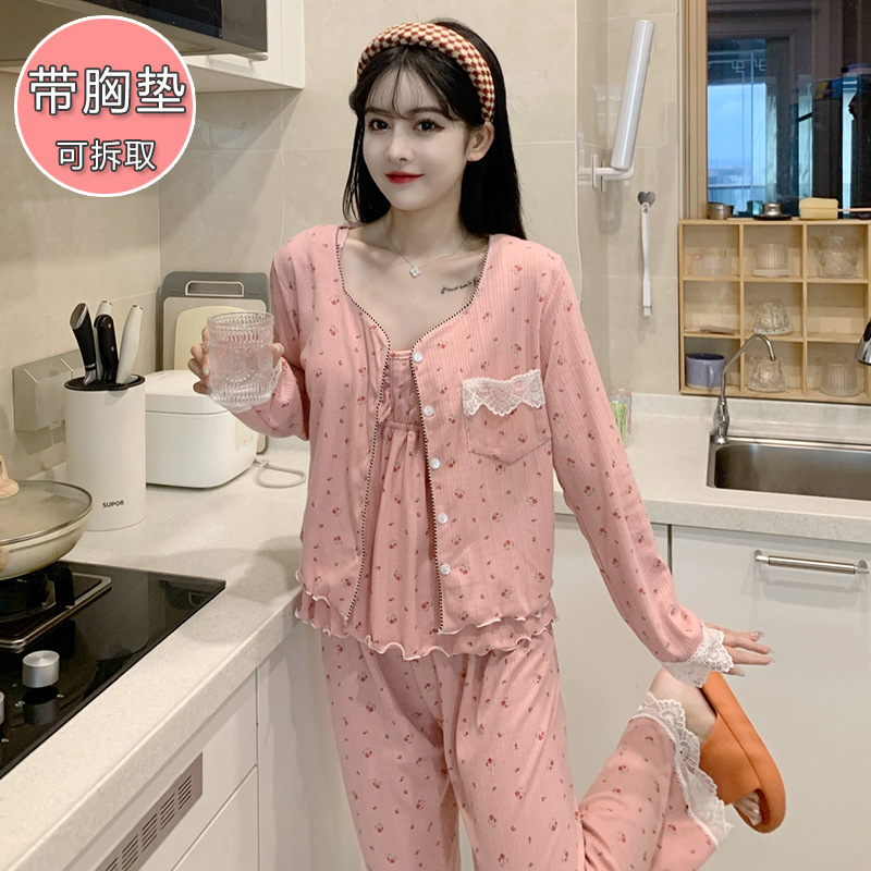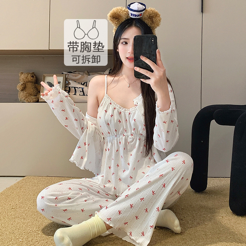 2025 봄 여름 신상 3종 세트 6535 면 패딩 탈착식 조끼 + 긴팔 + 바지 여성 잠옷
