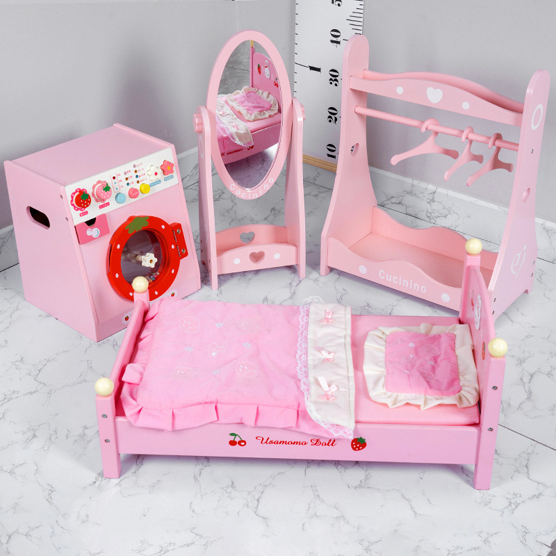 Mupin 새로운 나무 어린이 세탁기 장난감 세트 유치원 현실적인 인형 침대 소녀 생일 선물