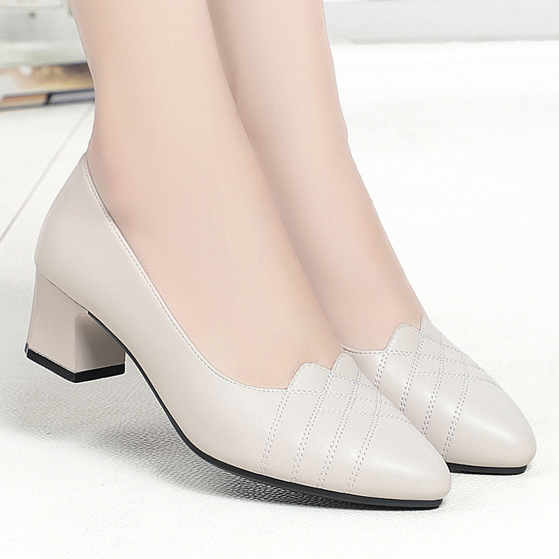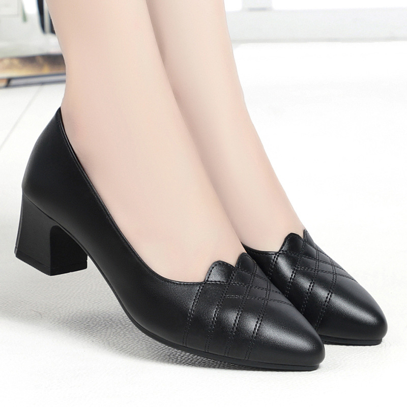 새로운 봄과 가을 여성 신발 2022 여성을위한 미드 힐 싱글 레이어 신발 낮은 입 어머니 신발 부드러운 가죽 부드러운 부드러운 바닥 편안한 청키 힐 가죽 신발스토어 가기