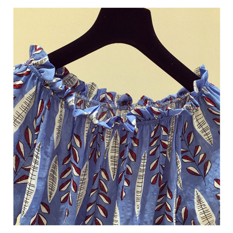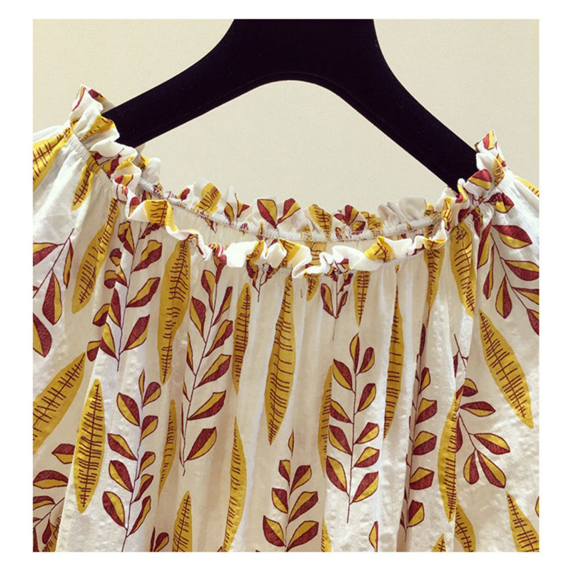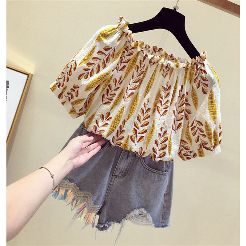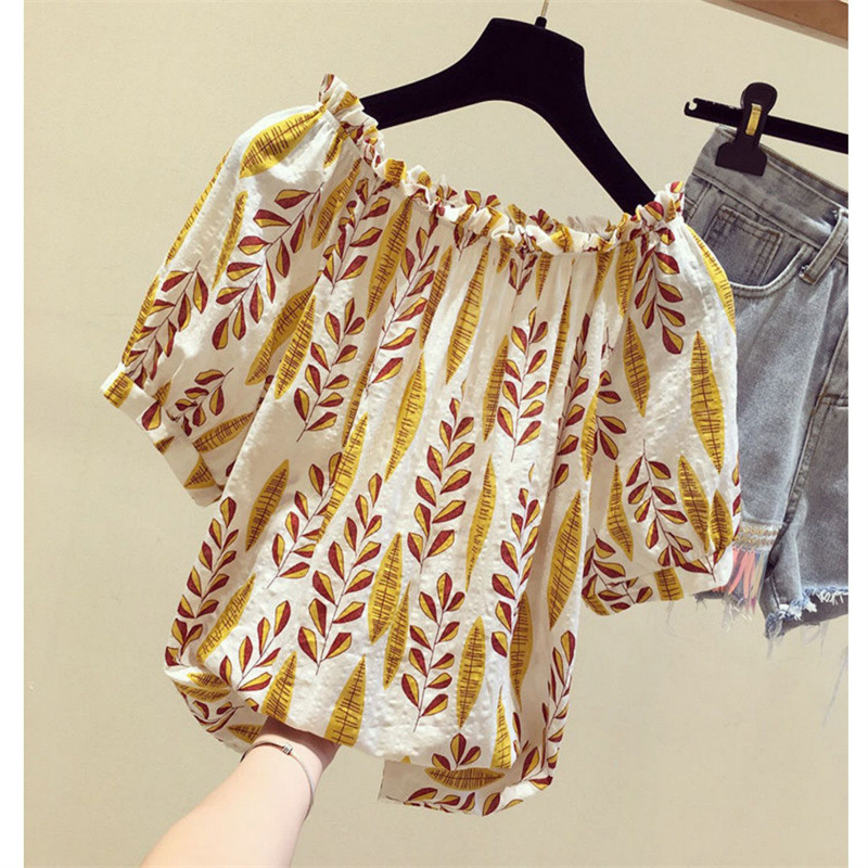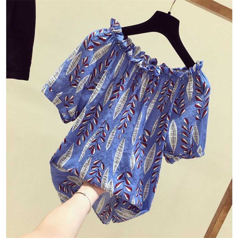 여성용 오프 숄더 쉬폰 셔츠 여름 오프 숄더 탑 여성용 반팔 한국-외국 가스 커버 배꼽 슬림핏 플로럴 루스 티셔츠 여성용