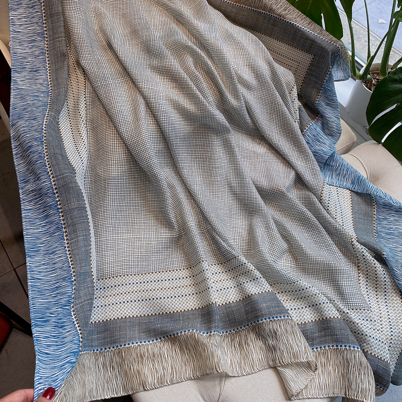 일본과 한국 스타일의 면화와 린넨 핸드 프린팅 큰 사각형 스카프 동남아시아에 수출 일반 라이트 블루 격자 무늬 면화와 린넨 스퀘어 스카프