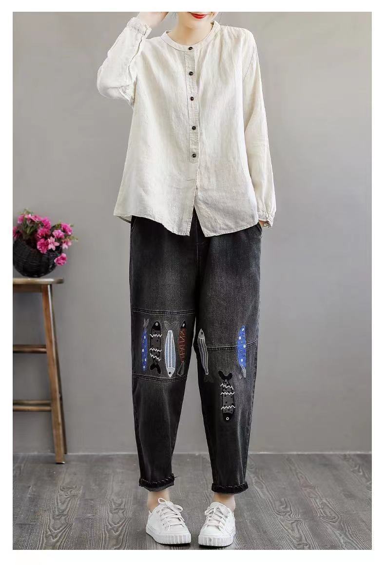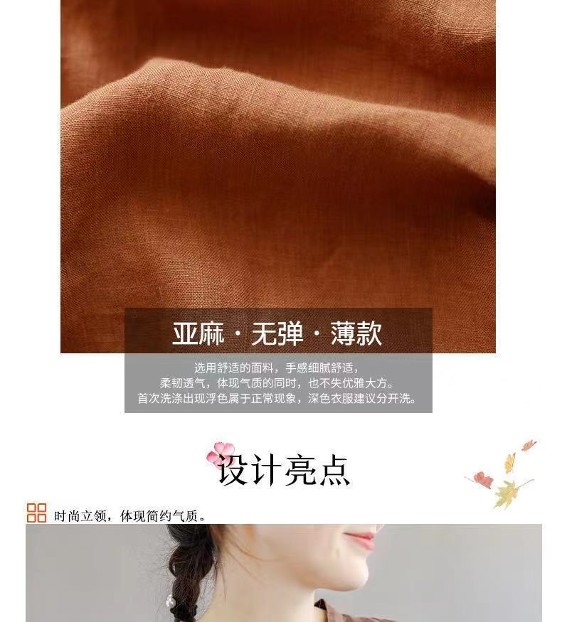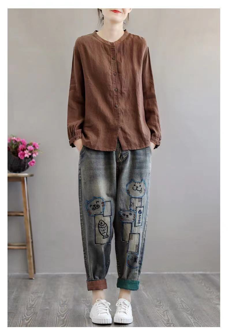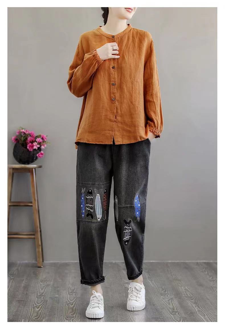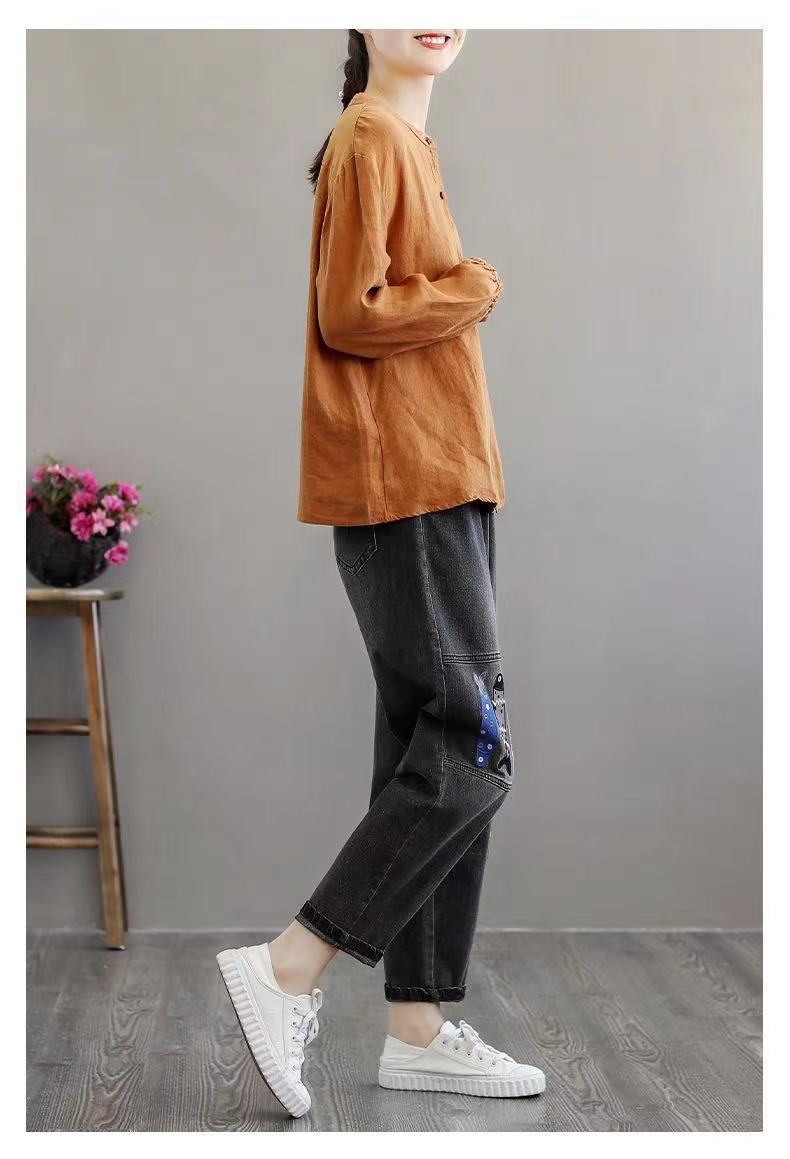 여성용 가을 코튼 리넨 셔츠 느슨한 라운드 넥 셔츠 캐주얼 코트 어머니의 작은 셔츠 탑 중년 및 노인 긴 소매
