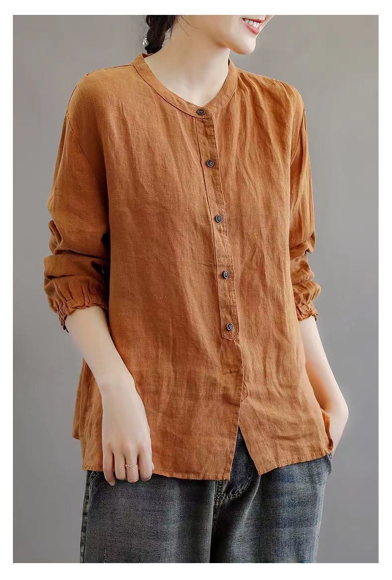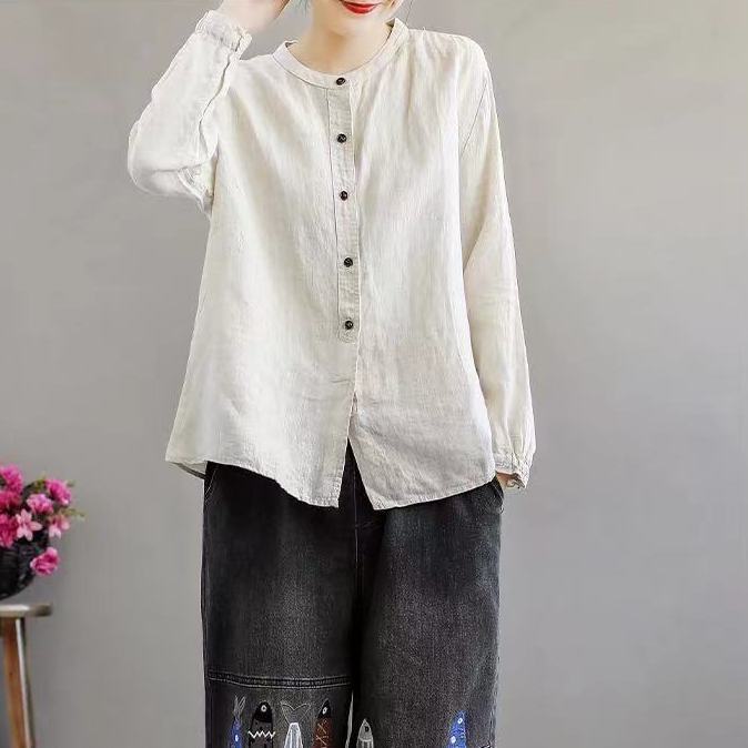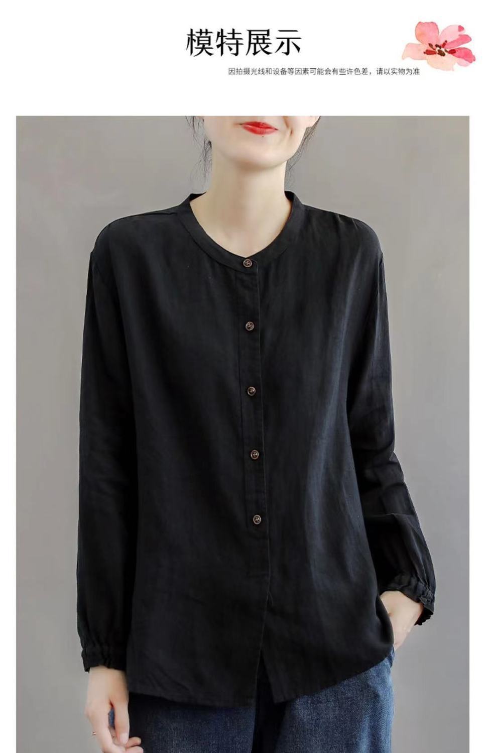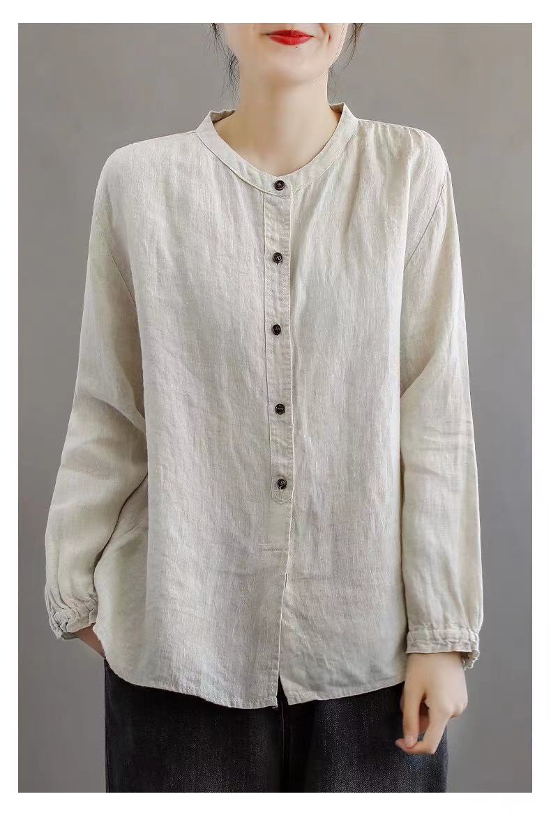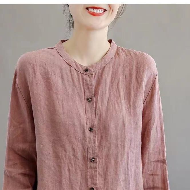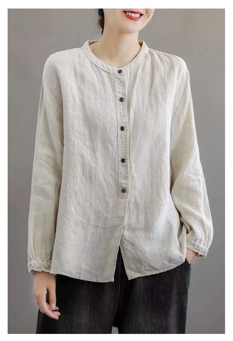 여성용 가을 코튼 리넨 셔츠 느슨한 라운드 넥 셔츠 캐주얼 코트 어머니의 작은 셔츠 탑 중년 및 노인 긴 소매스토어 가기