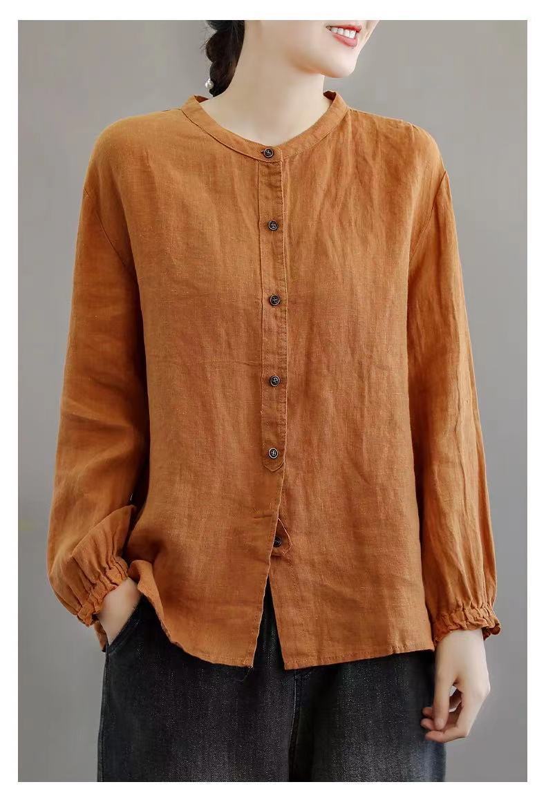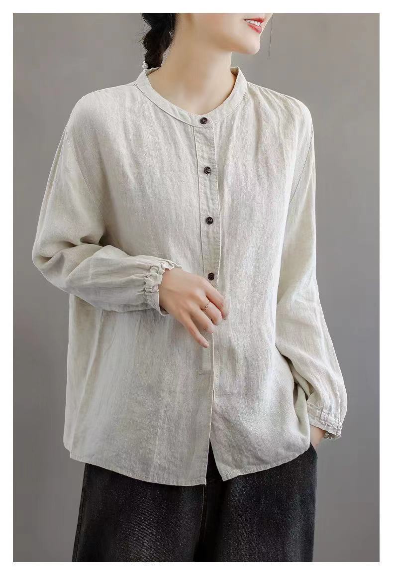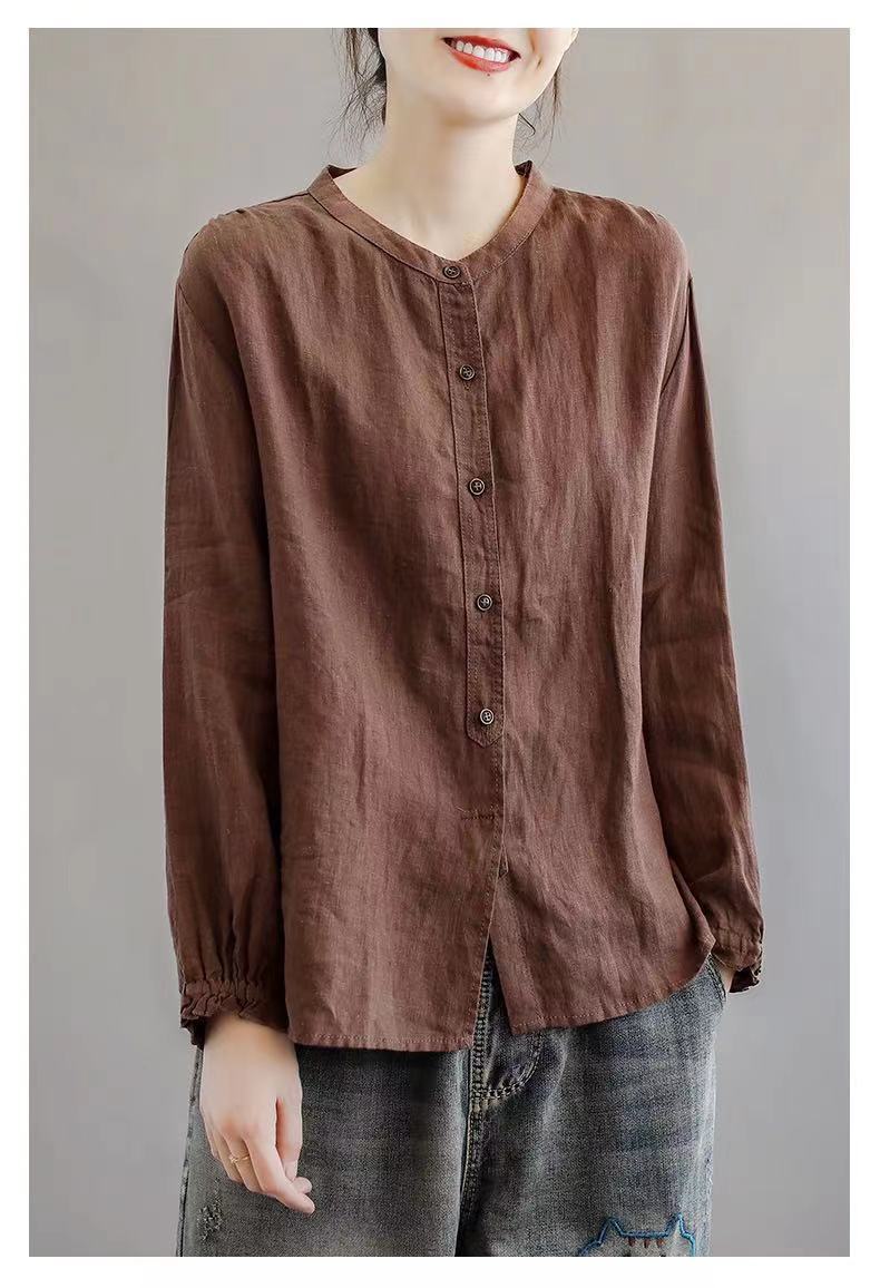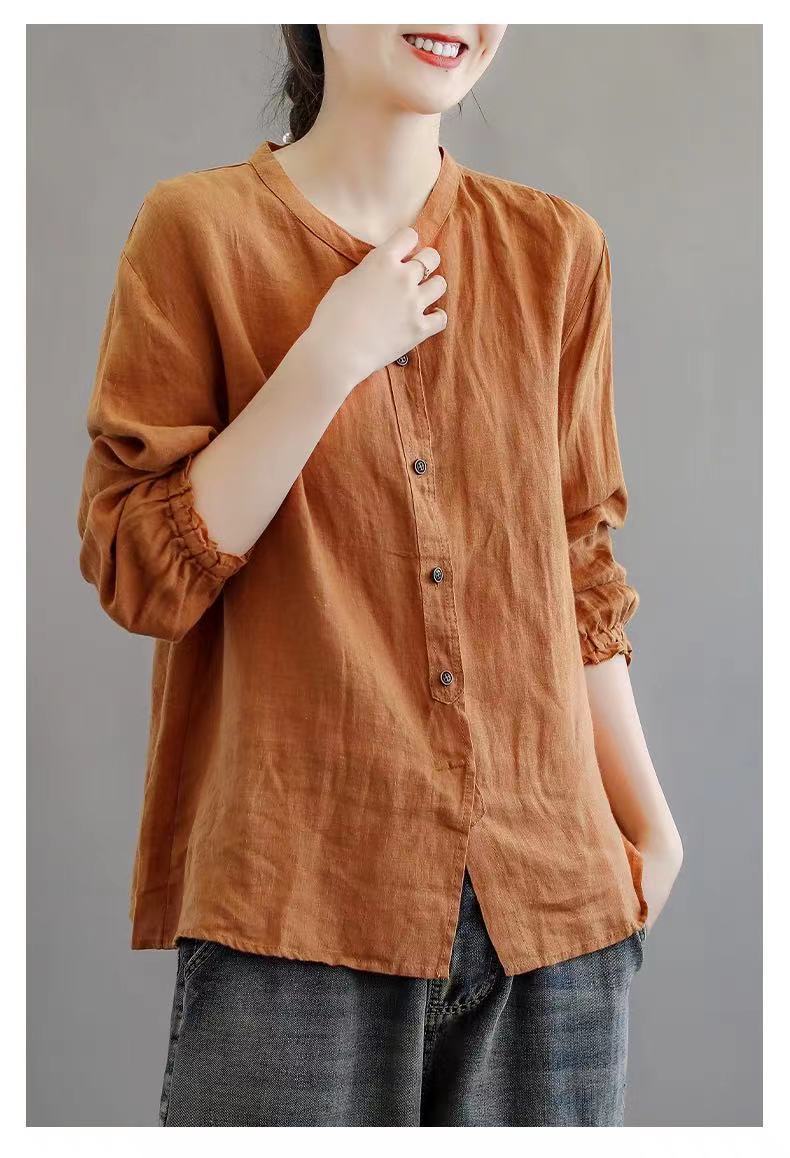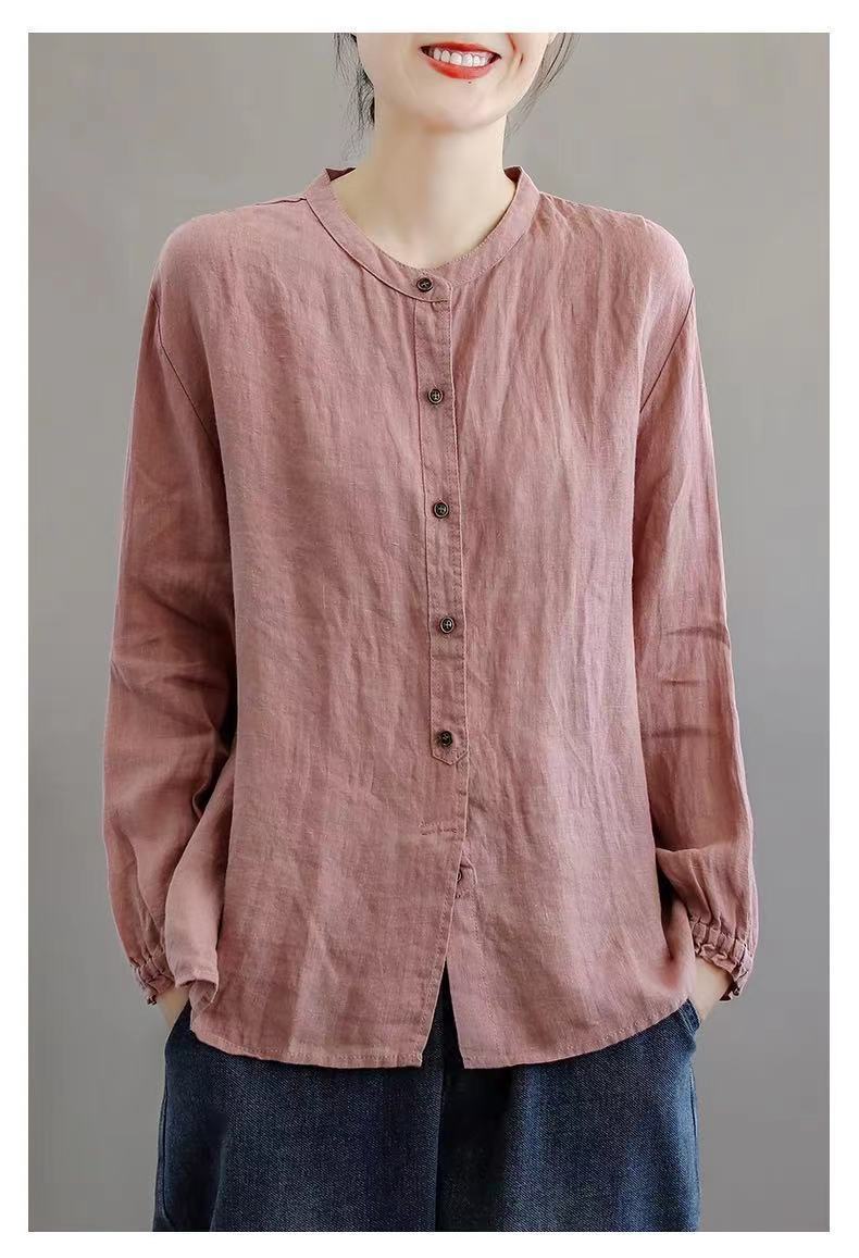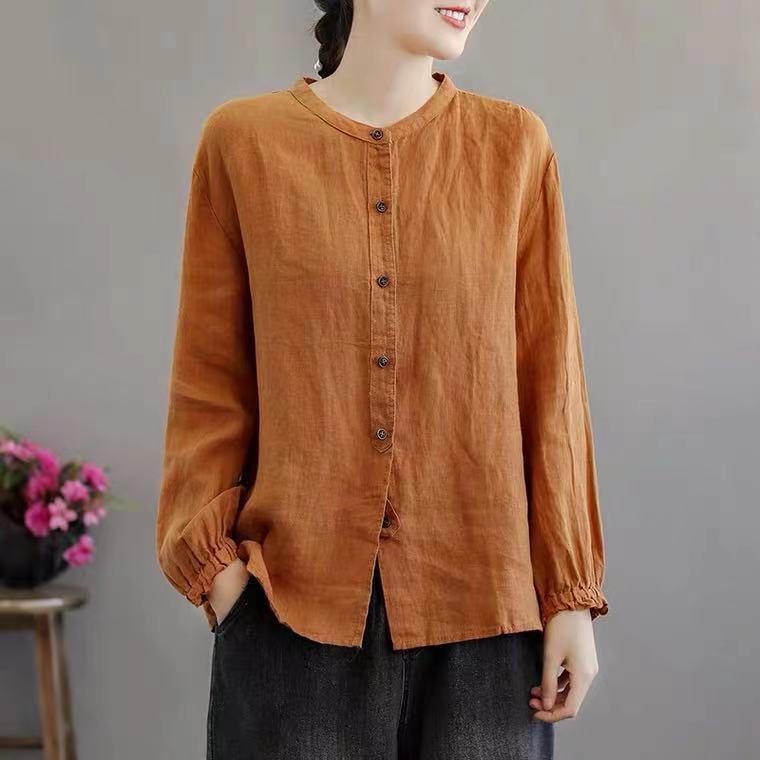여성용 가을 코튼 리넨 셔츠 느슨한 라운드 넥 셔츠 캐주얼 코트 어머니의 작은 셔츠 탑 중년 및 노인 긴 소매스토어 가기