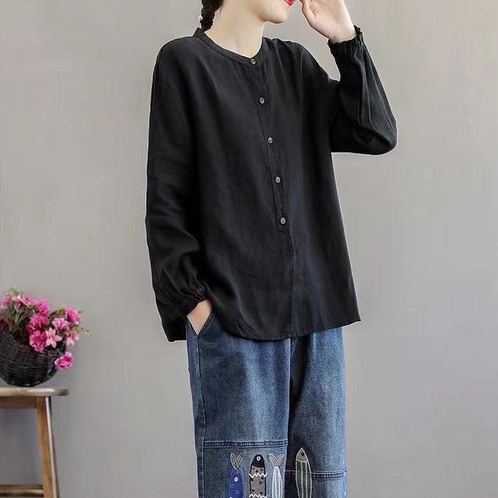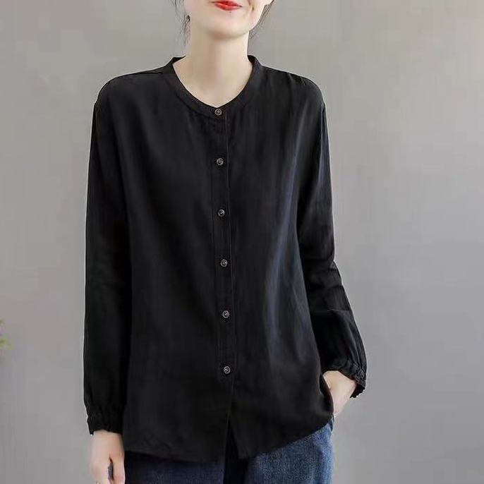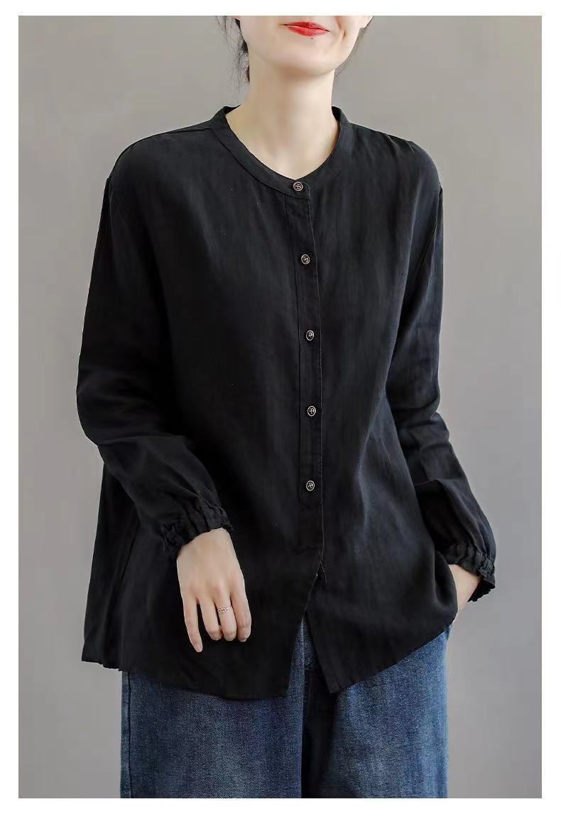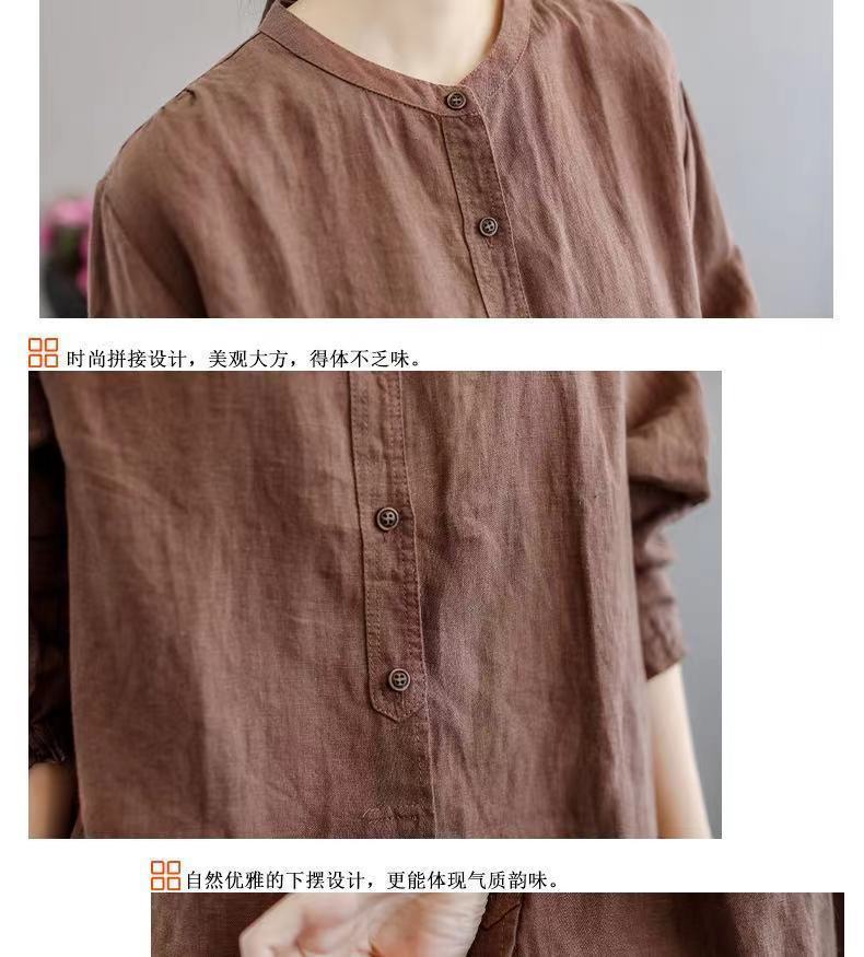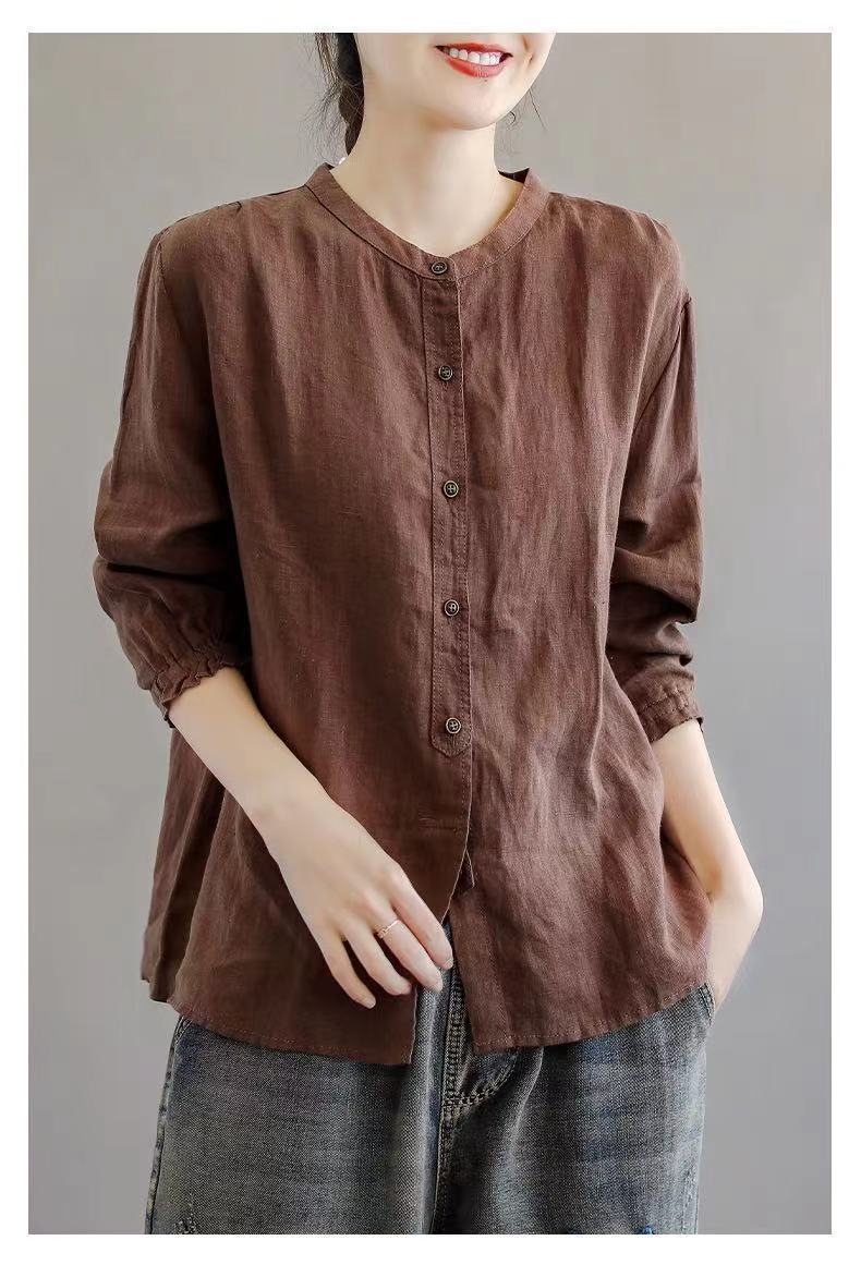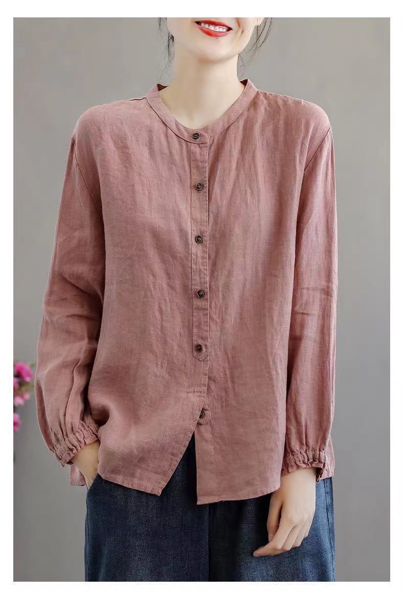 여성용 가을 코튼 리넨 셔츠 느슨한 라운드 넥 셔츠 캐주얼 코트 어머니의 작은 셔츠 탑 중년 및 노인 긴 소매스토어 가기