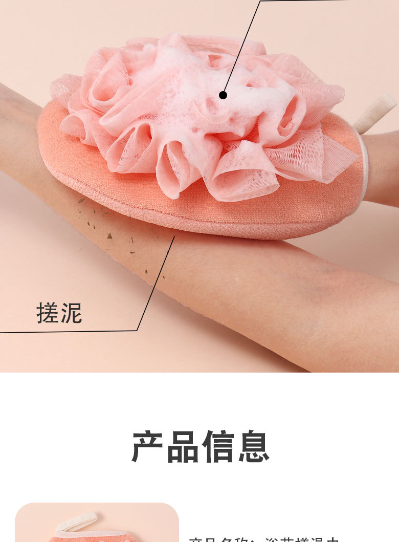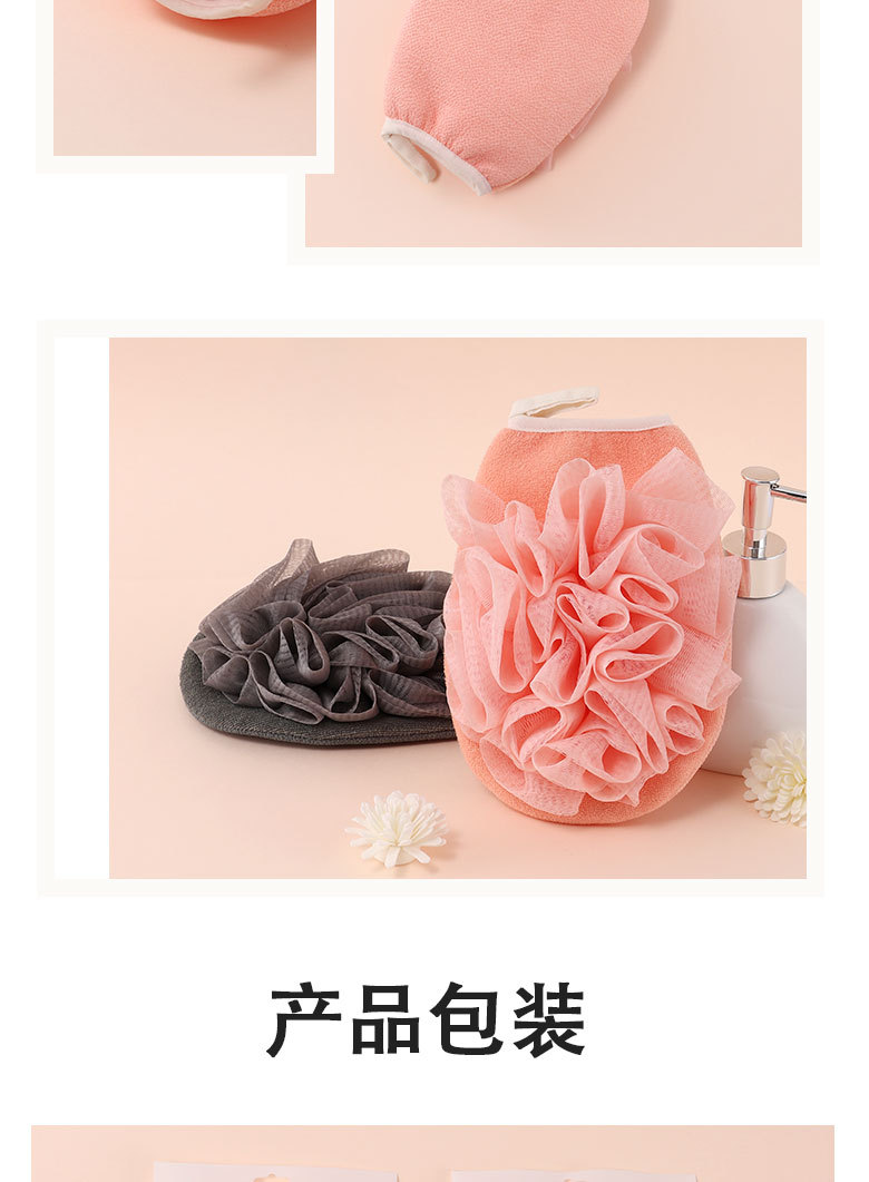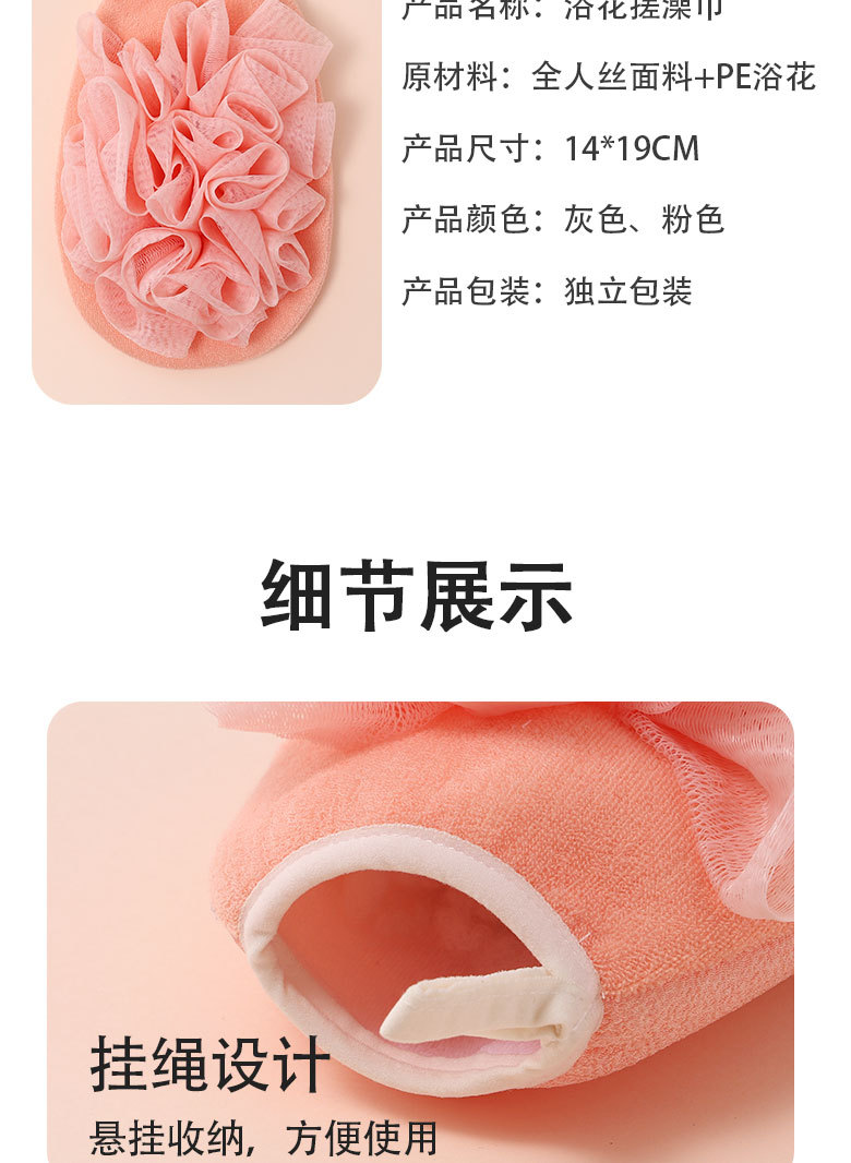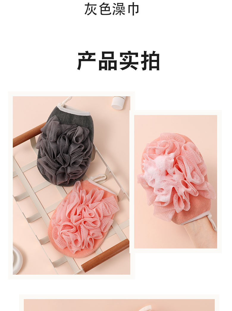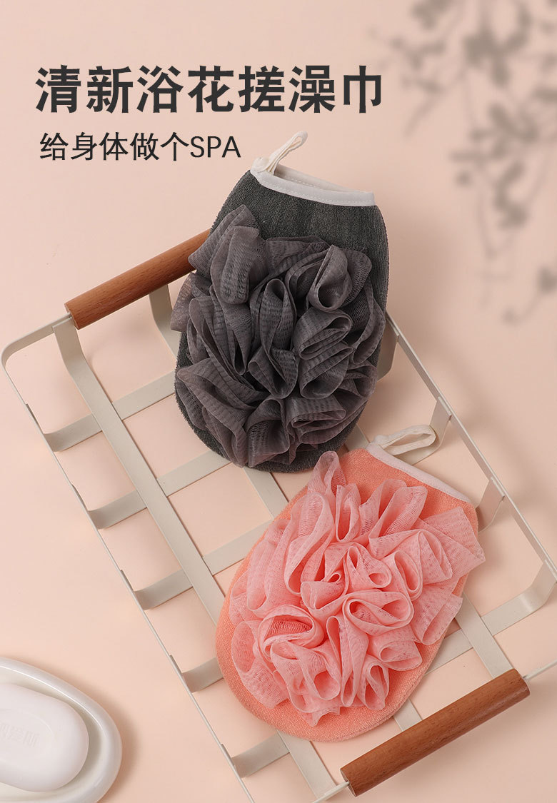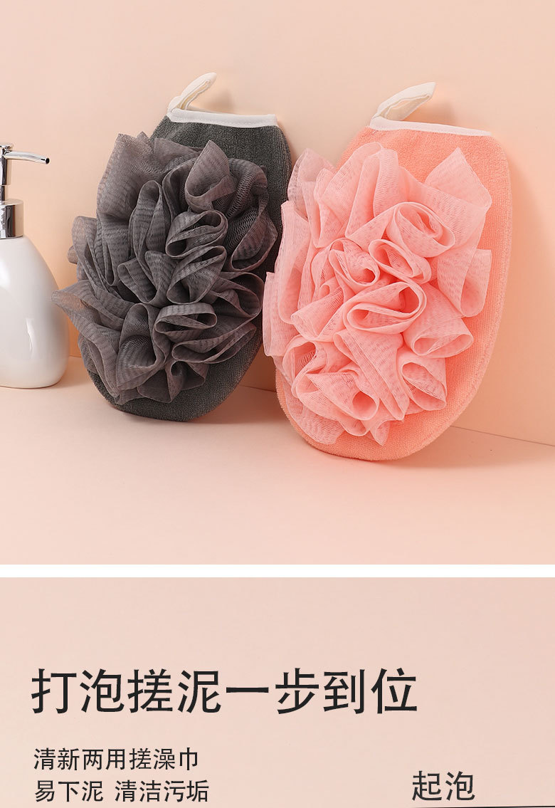 产品采用双面设计,以面浴花,以面搓澡巾,二合一皮肤起泡搓澡巾。