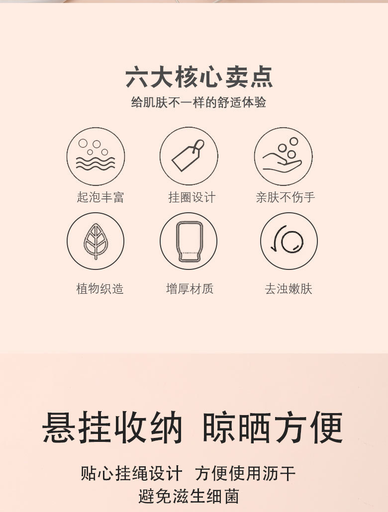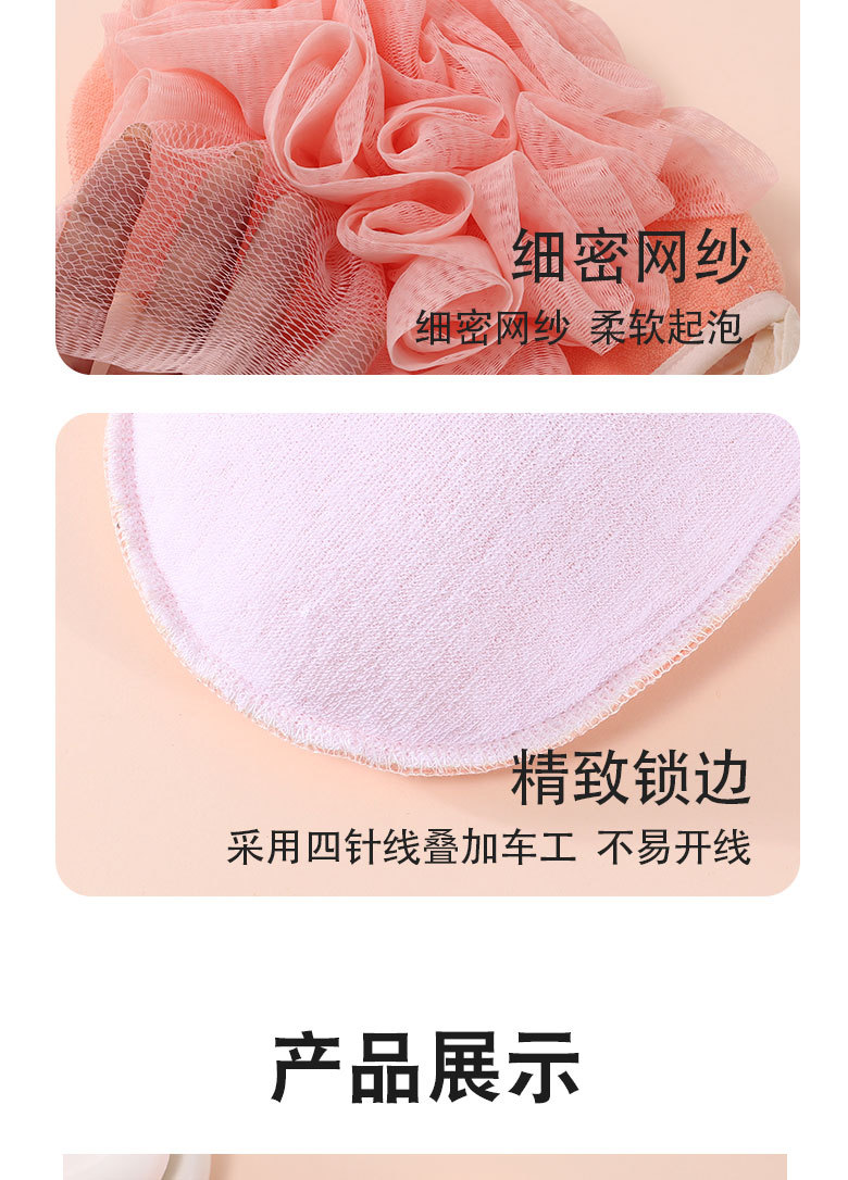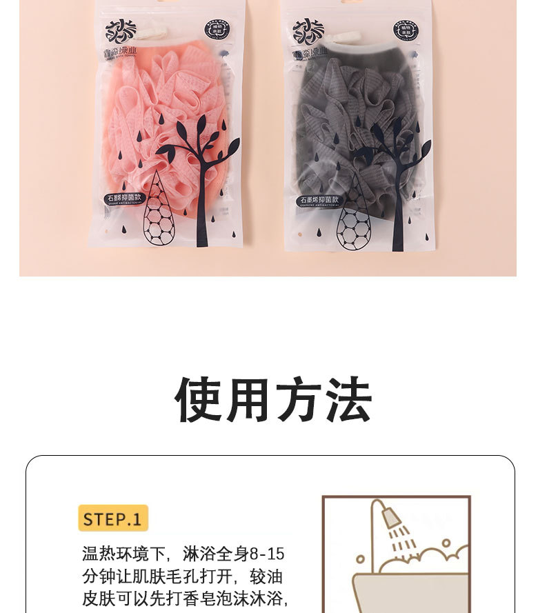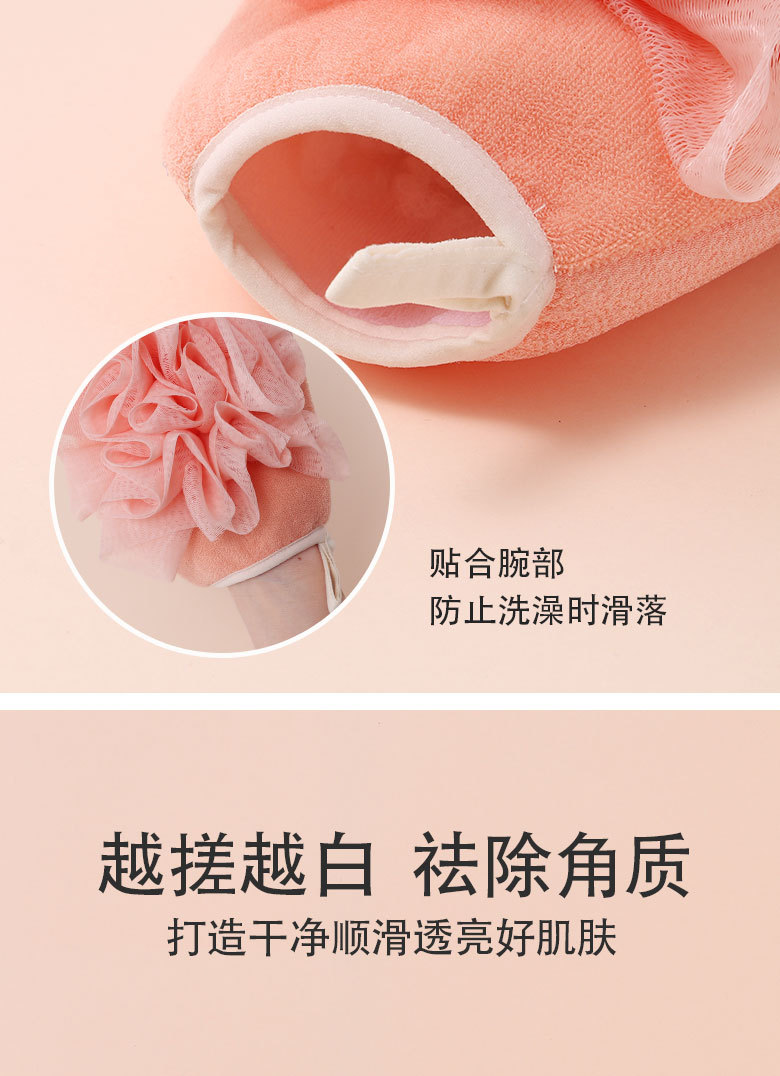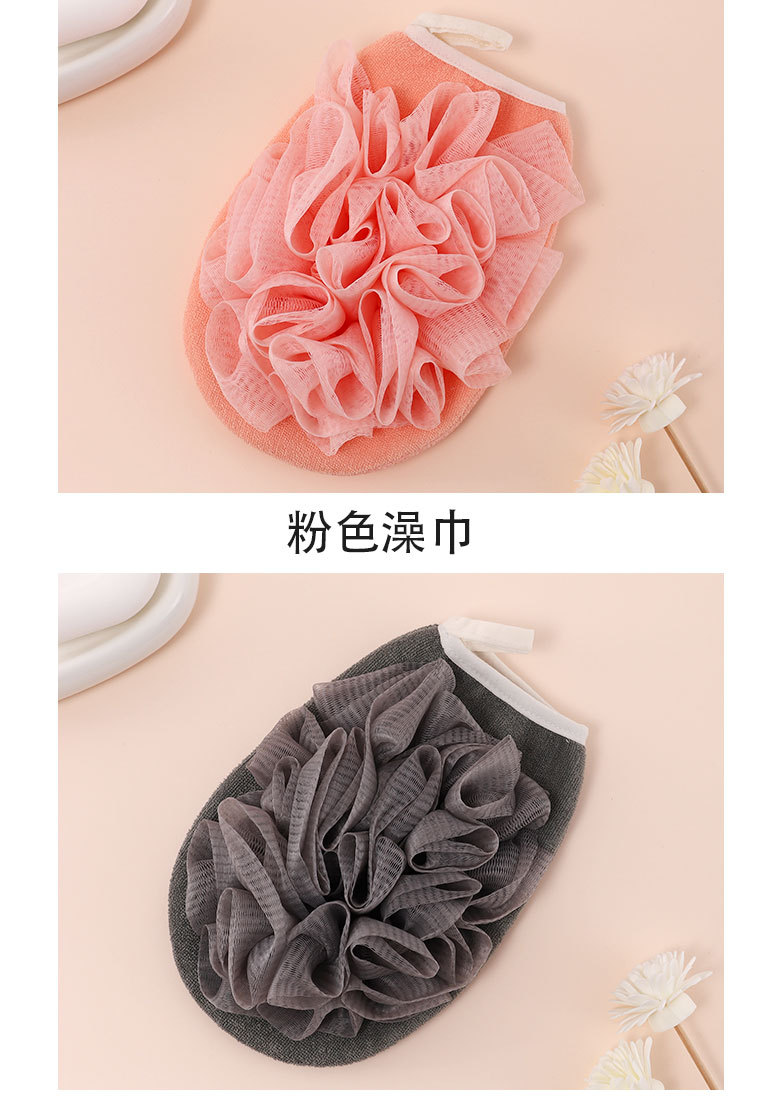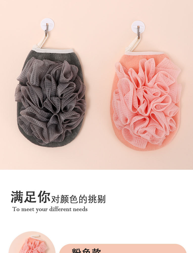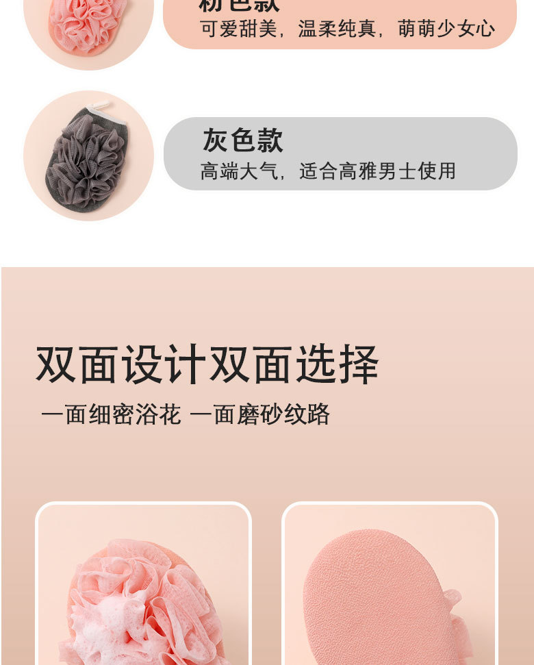 产品采用双面设计,以面浴花,以面搓澡巾,二合一皮肤起泡搓澡巾。
