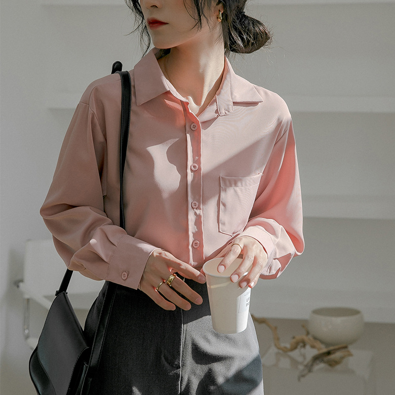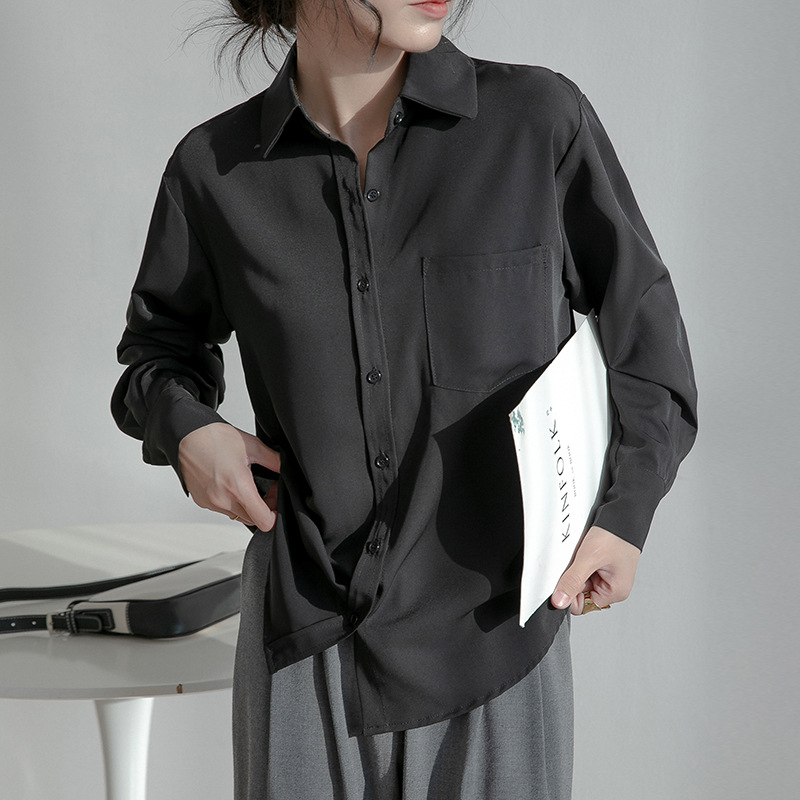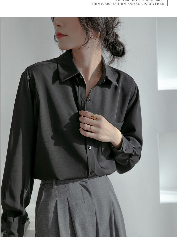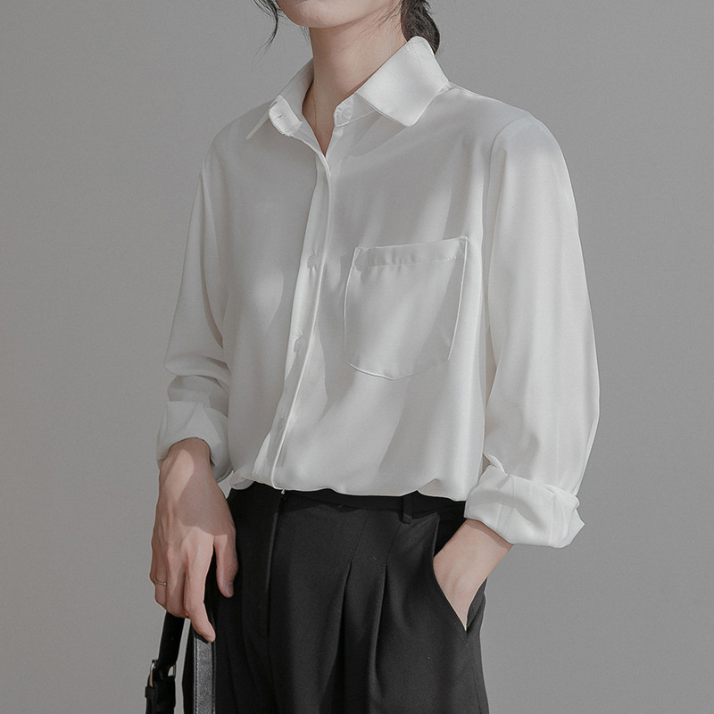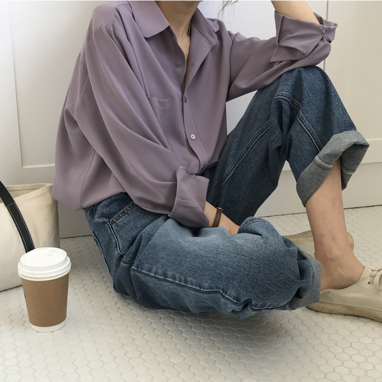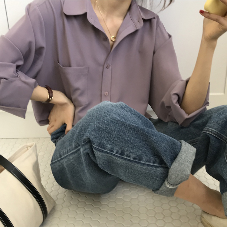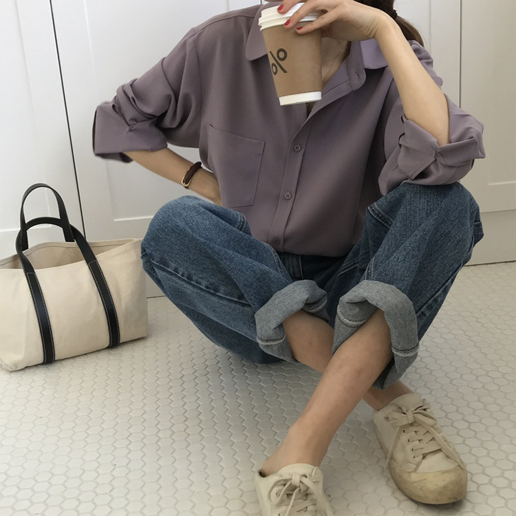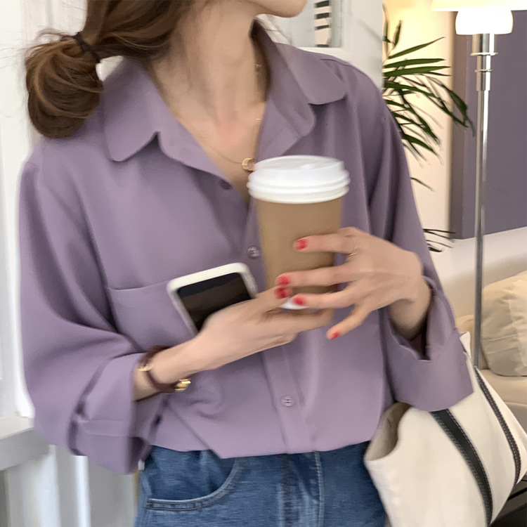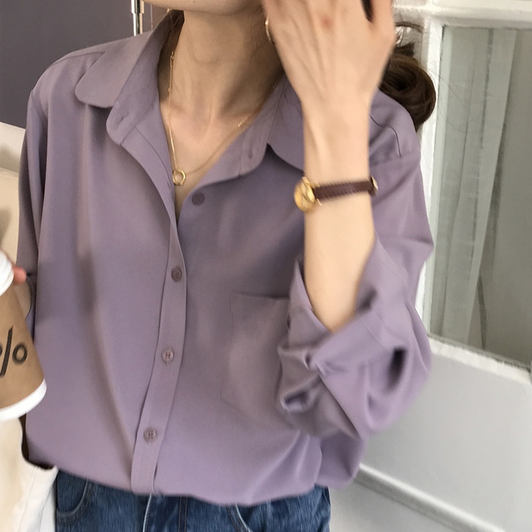 재고 2022 봄과 가을 디자인 감각 틈새 홍콩 맛 타로 퍼플 셔츠 여자의 최고 실키 긴 소매 셔츠스토어 가기