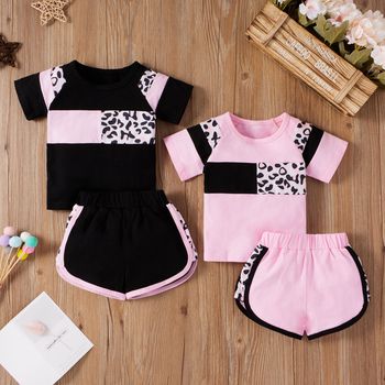 宝薪童装外贸跨境欧美豹纹拼色短袖上衣短裤两件套套装 一件代发