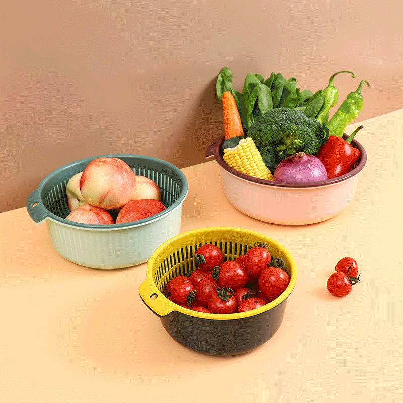 새로운 대비 색상 더블 레이어 배수 바구니 주방 세척 바구니 플라스틱 중공 배수 세트 다기능 플라스틱 보관 바구니