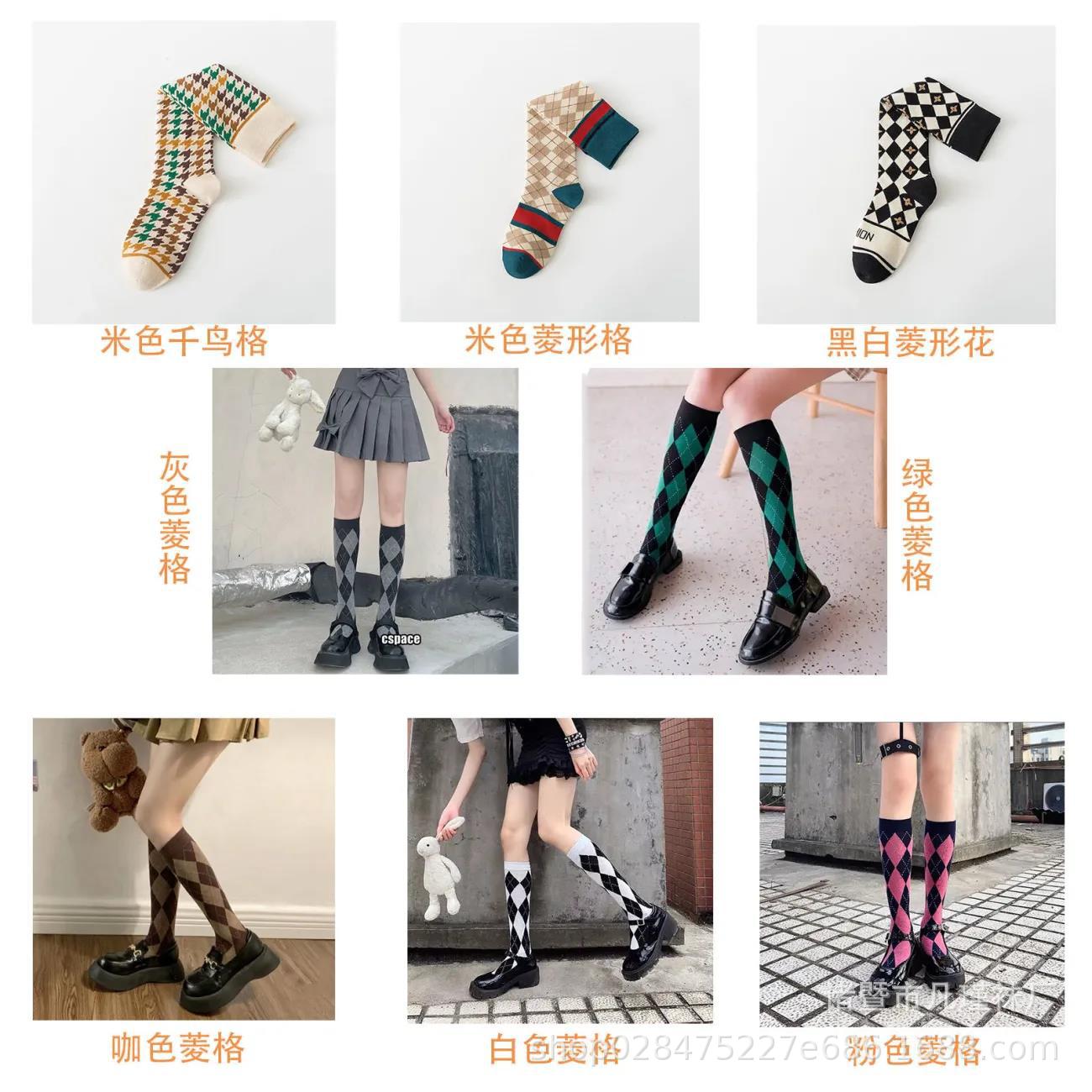 양말 여성용 신상품 빈티지 Houndstooth 다이아몬드 패턴 대학 스타일 커프 양말 영국 스타일 모든 매치 슬림 롱 양말스토어 가기