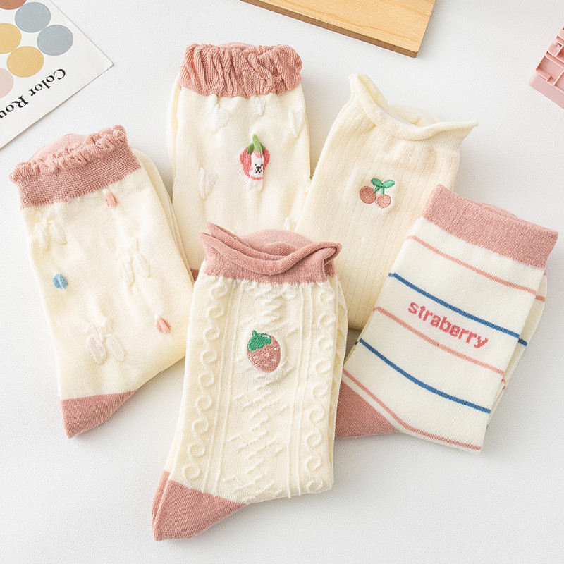 봄과 가을 새 양말 여성 양말 면화 과일 패턴 패션 양말 레이스 소녀 스타킹 제조 업체 도매스토어 가기