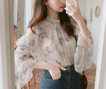 2 023 봄과 여름 새로운 한국 패션 숄더 레이디 프린트 혼 긴 소매 쉬폰 셔츠 탑
