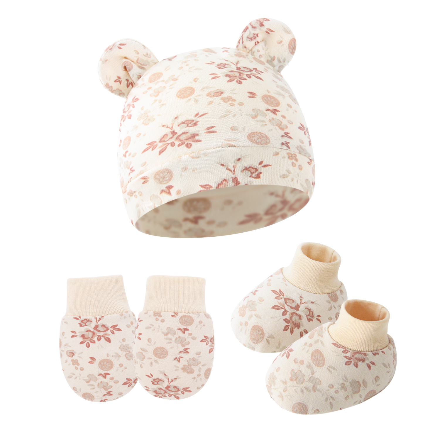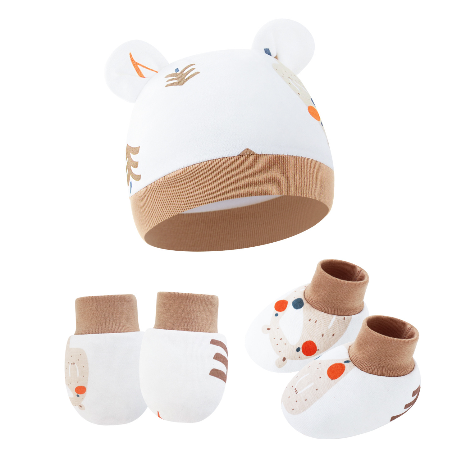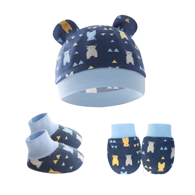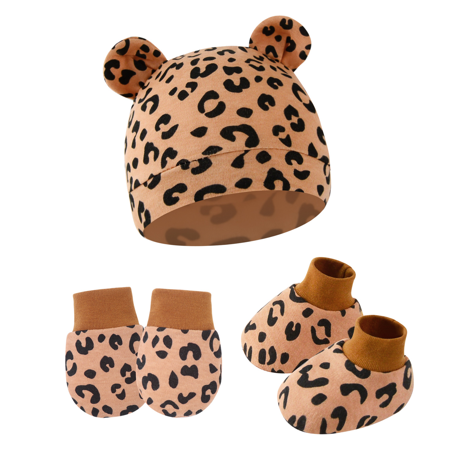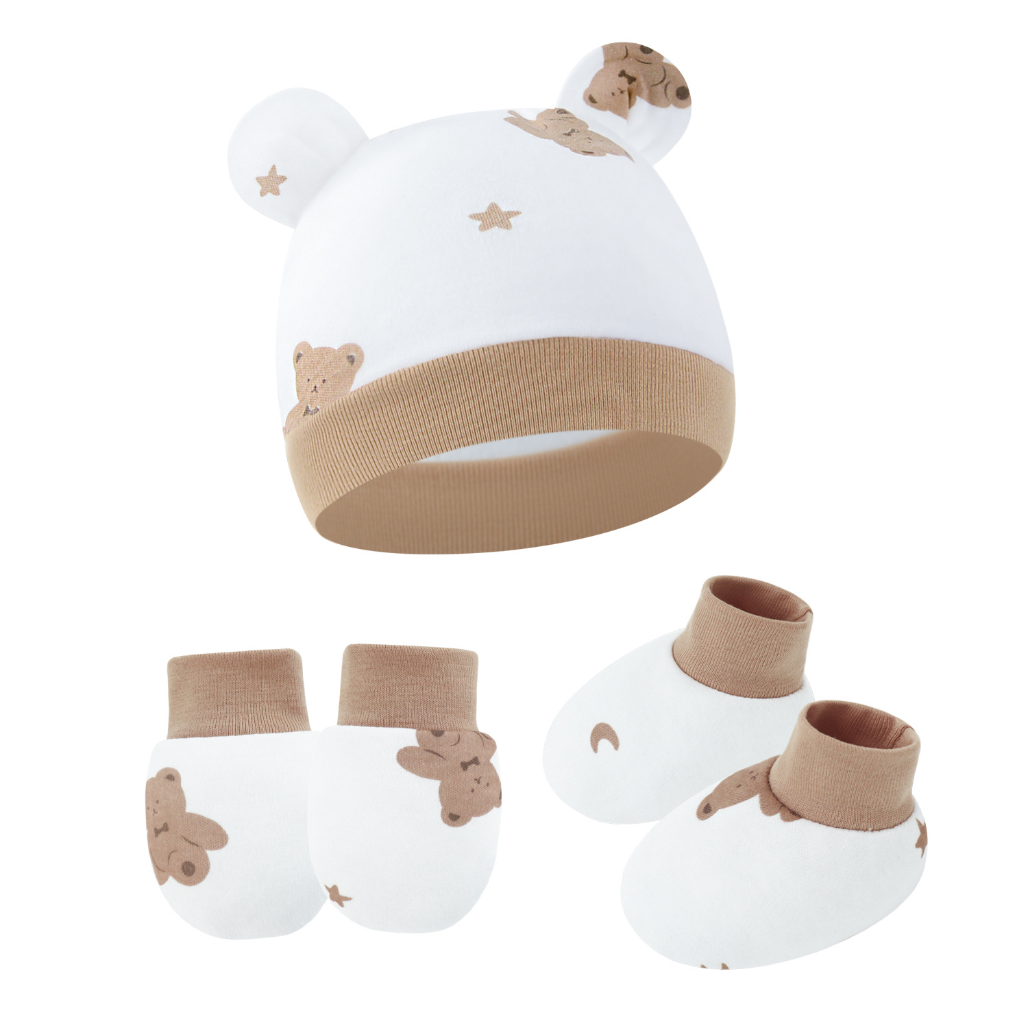 수출용 아기 모자, 아기 손발 보호장갑, 귀여운 곰돌이 모자, 신생아 귀달이 모자 (0-6개월)